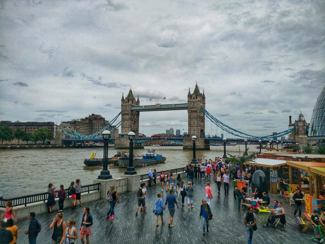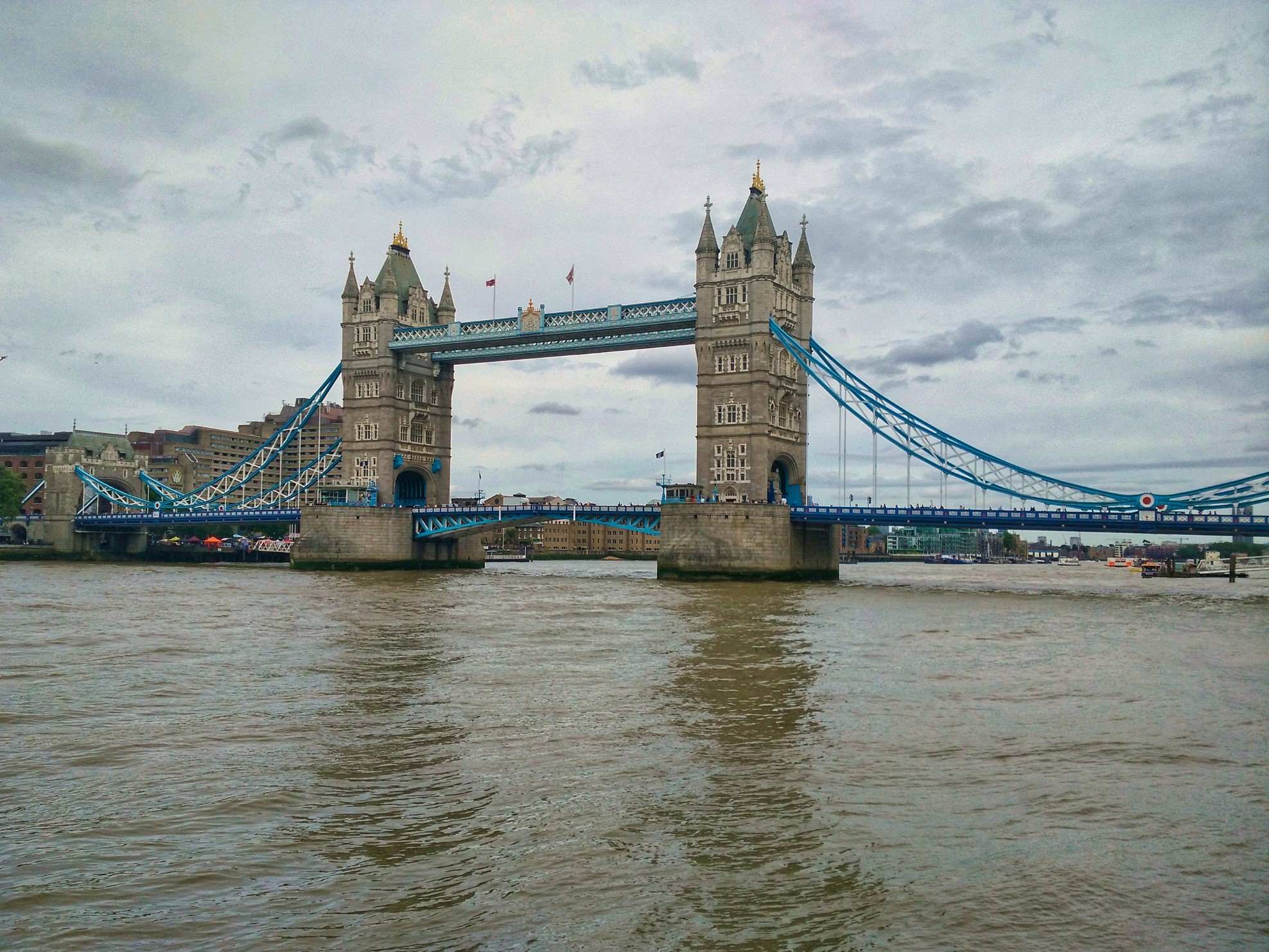 伦敦塔桥(Tower Bridge),因在伦敦塔附近而得名,是从泰晤士河口算起的第一座桥,也是伦敦的象征。该桥始建于1886年,塔桥的设计是为了同时满足航运和路面交通两方面的需要,如果巨轮鸣笛而来,下层桥面能够自动往两边翘起,以使轮船顺利通过。游人可在塔桥上步行浏览,不收费。但进入塔桥里面要买票,10镑左右,有一段类似玻璃栈桥,走在桥上透过玻璃可以看到脚下的行人和泰晤士河水,我觉得没必要花这个钱上去。