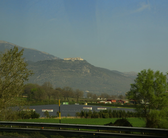 前往庞贝的高速公路最早是出自墨索里尼的手笔;加之路遇卡西诺山(Monte Cassino)有名的修道院(如下图),不由让人想起二战后期盟军与德军沿着古斯塔夫防线的史诗攻防战——这座一千多年前圣本笃(Saint Benedict)曾经访问过的修道院俯视着6号高速公路、扼守前往罗马的要冲,被盟军认为是德军所控制的据点而毁于一次大规模轰炸。然而事实上德国人反倒是恪守原则,直到修道院化为废墟之后他们的伞兵部队才开进卡西诺修道院的残砖断瓦之中。