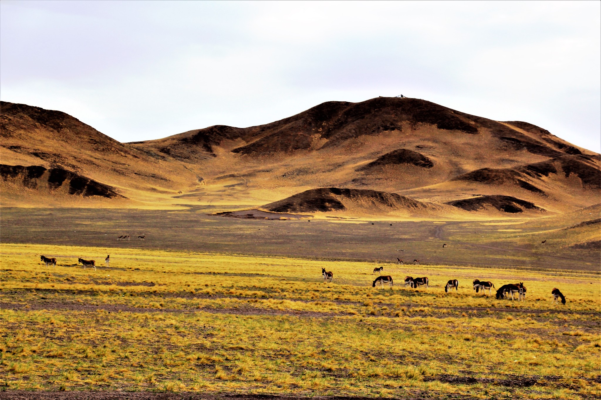 6月20日,那贡莫草原野生蔵驴成群,它们正悠闲自得在宽广的草原上觅食。