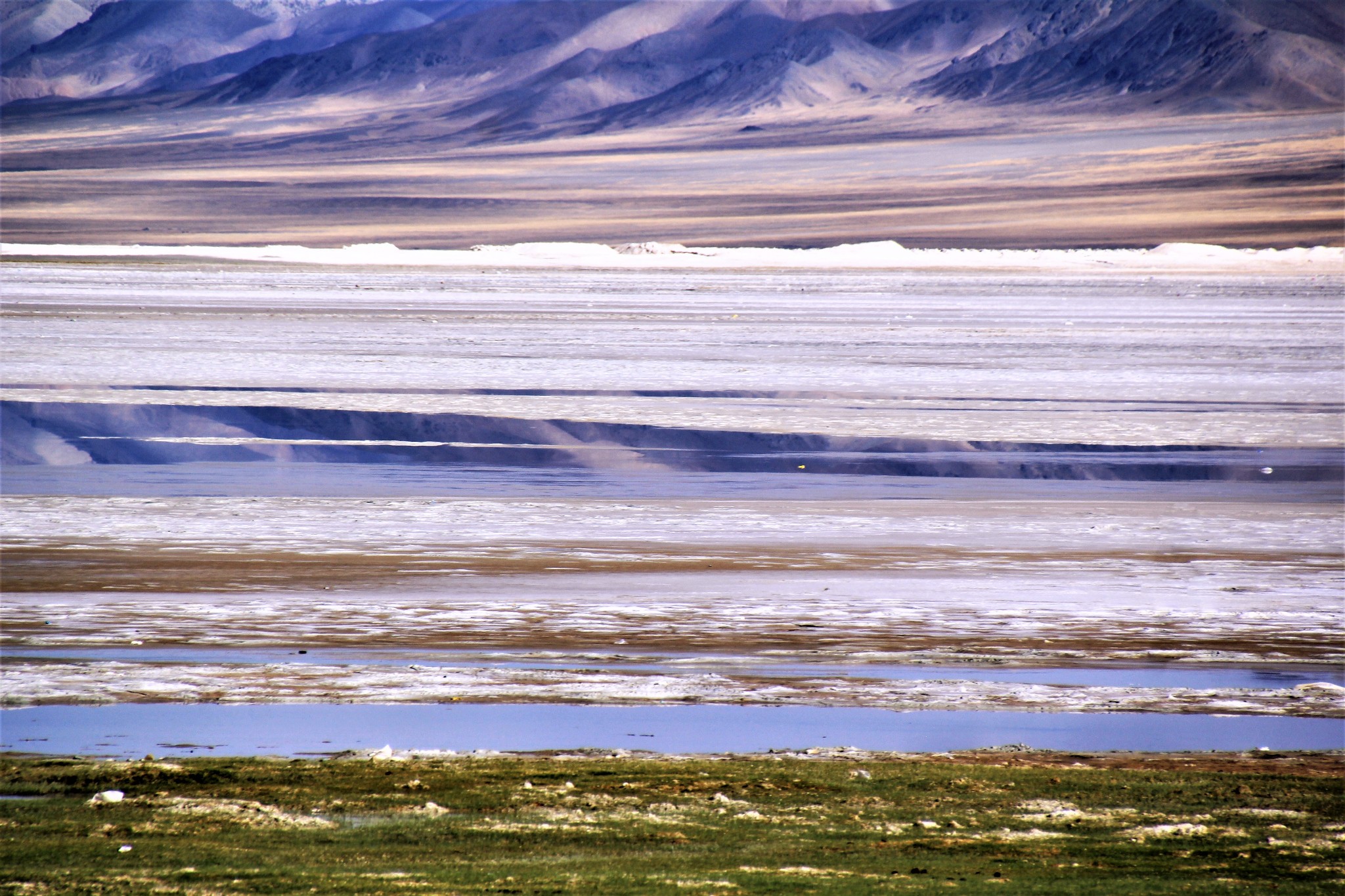 6月20日,扎仓茶卡盐湖。扎仓茶卡盐湖位于革吉县盐湖区,阿龙干累山北麓,S301省道北侧。东西长32公里,南北宽3~6公里。总面积132.5平方公里。著名的青海省海西蒙古族藏族自治州乌兰县茶卡镇的茶卡盐湖面积为105平方公里,而扎仓茶卡盐湖有135平方公里。与青海的盐湖相比,扎仓茶卡盐湖规模更大。扎仓茶卡盐湖基本上还处于原始状态,没有游客,也没有见到开采的设施。湖面遍是白茫茫的白色结晶体。