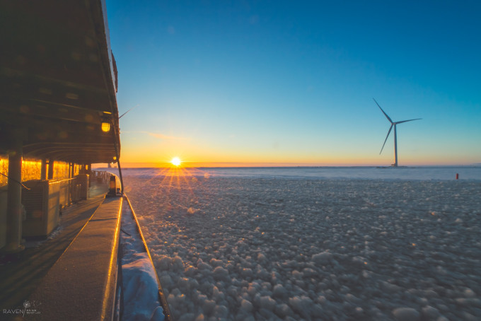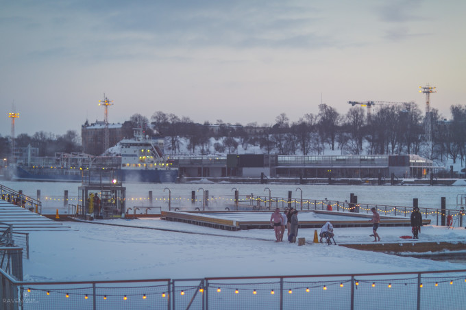 整个码头被冰雪覆盖,各式各样的船舶停靠在岸边,有些被改造成了餐厅,有些用来当做游览船只,我想在夏天这里会非常热闹吧。在码头上看到这个冒着热气的泳池,许多人光着身子跳下去游泳,看的我起了一身的鸡皮疙瘩,想想就超冷的!