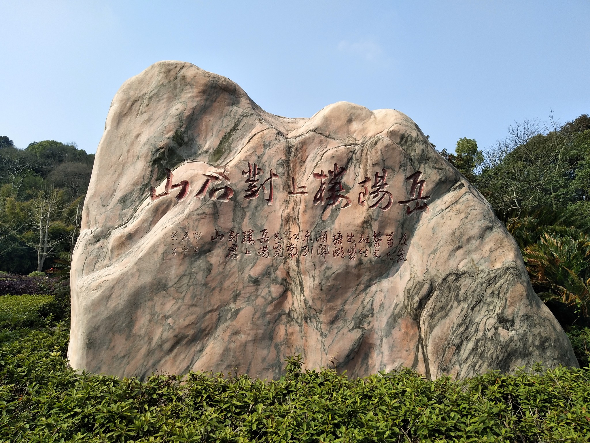 ▲公园内黄庭坚《雨中登岳阳楼望君山》诗(前两句)石刻,全诗如下: