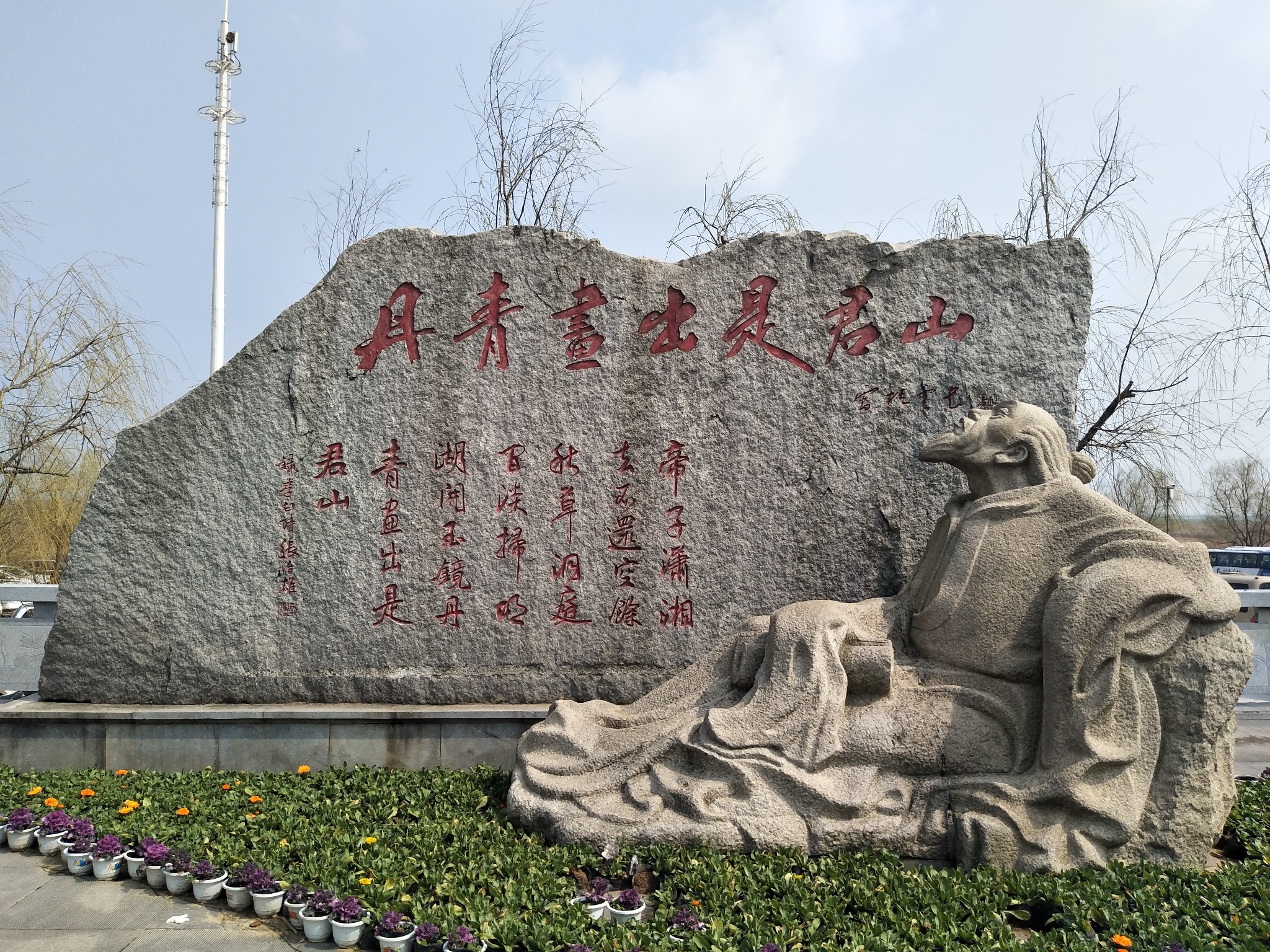 ▲与刘禹锡石像及诗东西相对东边的李白石像及赞美洞庭湖及君山美景的诗《陪族叔刑部侍郎晔及中书贾舍人至游洞庭五首》,石上所刻为最后两句,全诗如下: