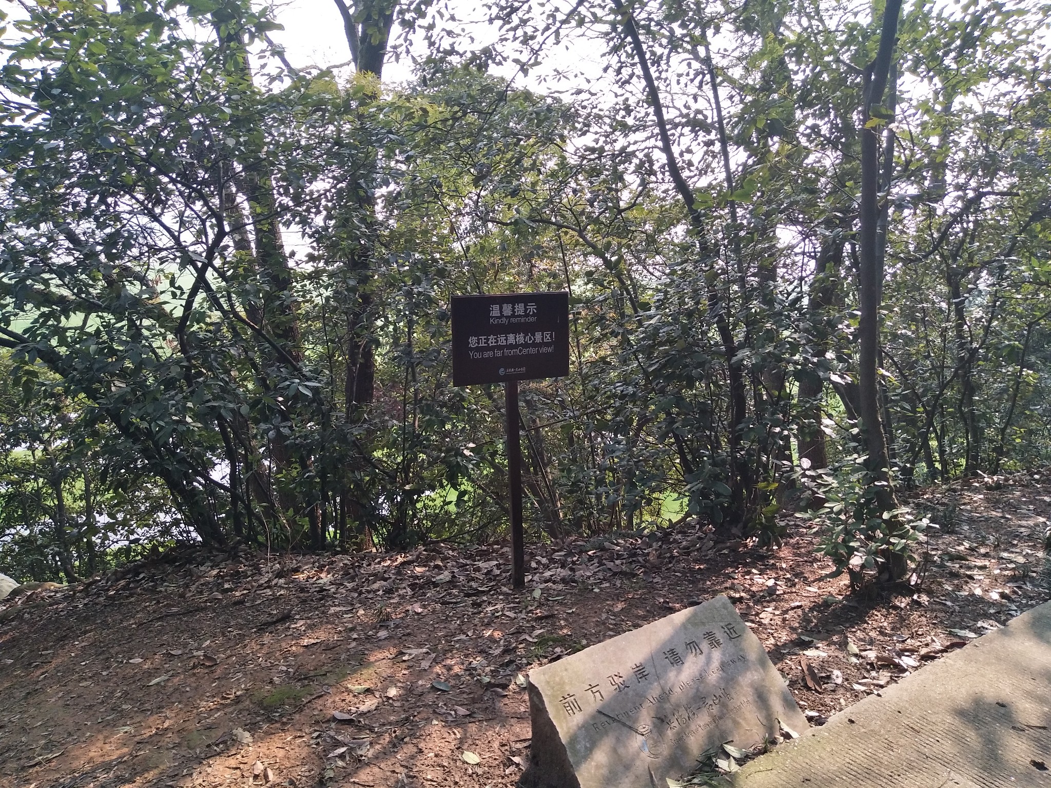 ▲如果您像我一样溜达到不见人烟的区域,尤其看到这个提示牌就要注意,上面写着“您正在远离核心景区”。这时候您就要掂量着自己的时间、体力和包里的饮水和食物了。前面就是君山的大山林了。由于晚上还要赶回武汉,傍晚要准时到车站候车,所以尽管对君山的山林好奇,也只得见好就收。