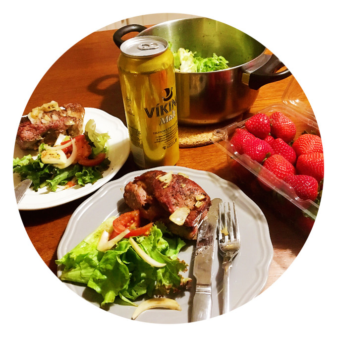 晚上在超市买了羊排、生菜、草莓和啤酒,还有面包、火腿片、cheese(为了第二天午饭准备三明治)。一切都很完美!冰岛的超市连锁的比较大的大概有三家:Kronan、Bonus(标志是个小猪,感觉这个名字起得和美廉美有一拼