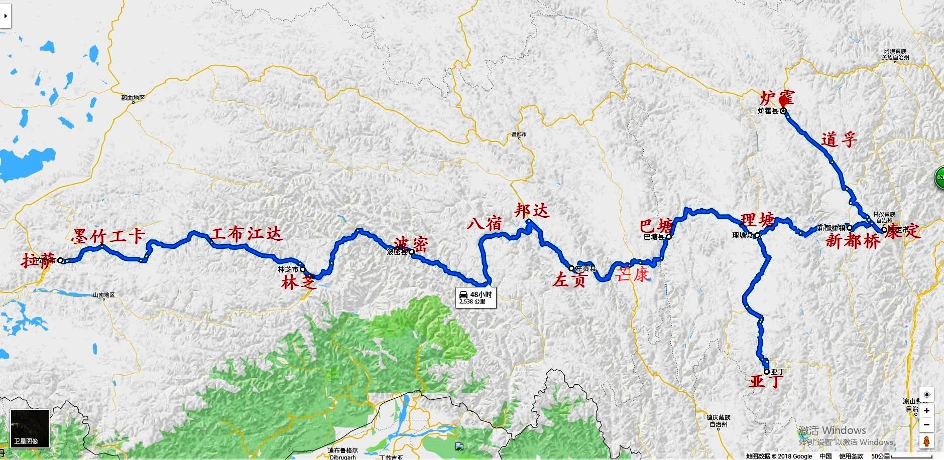 6月23日到达拉萨,结束了我们阿里、藏北之行。24日开始了我们前往川西高原的行程。当日我们沿林拉高速公路沿途经过墨竹工卡、工布江达县抵达林芝。途中翻越位于工布江达县海拔5013米的米拉山垭口。米拉山垭口是G318川藏公路翻越的海拔第二高的通行点。25日从林芝沿G318川藏公路抵达波密。途中翻越地处林芝鲁朗的海拔4568米的色季拉山垭口和游览林芝鲁朗林海风光。26日从波密继续沿川藏公路南线经八宿、邦达到达左贡。川藏公路从波密到竹巴笼金沙江大桥, 进入著名的南北纵向横断山脉三山三江地带。公路由此进入了长达800余公里的,地势呈不断下降的“漕沟状地质破碎路段”。雨季盛行时,肆虐的泥石流及山体滑坡令大地几成“蠕动状”,其威力足以使车行此地的人惊心动魄。从翻过西藏林芝县境内的色季拉山口开始,此线有盘不完的山,淌不完的河。从八宿到到邦达要经过318国道著名的怒江72拐即川藏公路怒江天险。从最低点海拔3100米,一路攀升到最高点业拉山口海拔4651米,再盘旋下降至邦达镇海拔4100米。长达20多公里天险之路委实的令人胆战心惊。左贡是我们在西藏投宿的最后一站。27日从左贡经芒康过竹巴笼金沙江大桥告别西藏进入四川巴塘。途中翻越位于左贡县境内海拔5130米的东达山垭口。东达山垭口是川藏南线上海拔最高的垭口。翻越东达山垭口继续行驶大约50公里,进入川藏线又一段险象环生的路段,翻越芒康觉巴山。觉巴山并不高,垭口的标高也只是3940米,但由于澜沧江千百年来的深深下切,使得江岸壁立千仞,一派荒凉与坚硬,给人以山高谷深的感觉。这里是横断山区的著名险段之一,30公里盘山路,近2000米的相对高差使觉巴山成了川藏线上最难爬、最费时的一座山,公路在绝壁上延伸,既没有护栏也没有路标,不少地方都是紧靠山体硬生生地开凿出来的,上依绝壁,下临深渊。川藏线虽然号称天险,但最危险的地方其实只有几处,比如排龙天险、通麦天险(如今排龙、通麦天险已不复存在。)和怒江天险。与这几处名声在外的天险相比,觉巴山的知名度确实不高,只有身临其境的人,才知道这个没有名气的天险与其他几个名声显赫的天险一样,同样让人望而生畏,步步惊心。28日从巴塘至稻城,途径“世界高城”理塘。29日从稻城前往亚丁风景区游览,夜宿香格里拉镇。30日从香格里拉到新都桥。结束了我们6月的行程。
