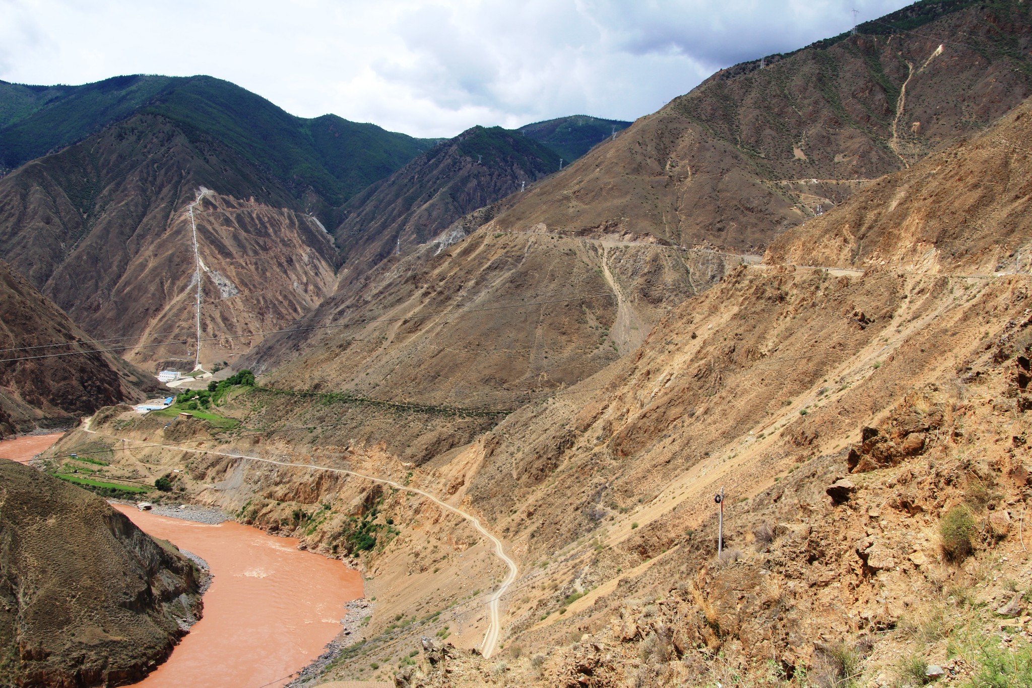 6月27日,穿越芒康县觉巴山的悬崖路段。觉巴山并不高,垭口的标高也只是3940米,但由于澜沧江千百年来的深深下切,使得江岸壁立千仞,一派荒凉与坚硬,给人以山高谷深的感觉。这里是横断山脉的著名险段之一,30公里盘山路,近2000米的相对高差使觉巴山成了川藏线上最难爬、最费时的一座山,公路在绝壁上延伸,既没有护栏也没有路标,不少地方都是紧靠山体硬生生地开凿出来,上依绝壁,下临深渊,令人恐惧无比。