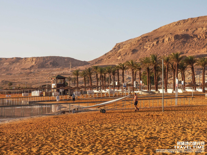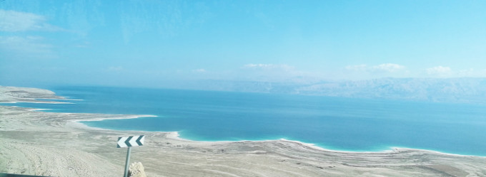 前往死海的车渐渐离开了城市和楼宇,脱离了现代化置身于一大片陡峭的犹地亚高地和沙漠中,从高地而下,途径犹太圣地马萨达,这里曾是犹太爱国者在这片土地上陷落的最后一个据点,带着悲壮的血色之地,如今成了死海途中许多游客必去的一个世遗景点。此时沿着崖边行走的车,窗外已开始出现那令人愉悦的蓝,心心念念的死海就在眼前了。