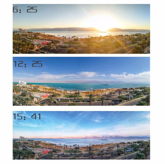 随着时间的轮转,眼前很快便能出现一大片金黄和一大片蓝。对着透明玻璃窗外逐渐蓝透的天和海美美的享用完丰盛的早餐时,死海的一天才算正式开始。