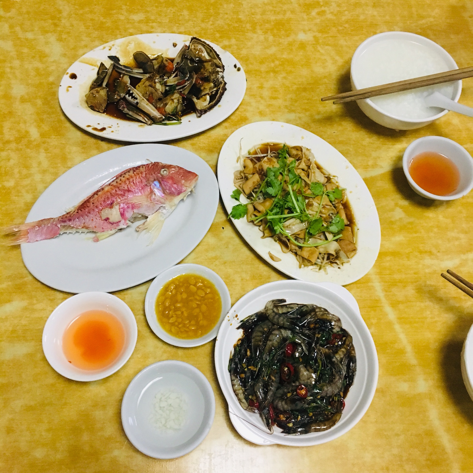 腌虾15、腌蟹30、鹅肠30、鱼饭15、白粥20(4碗)