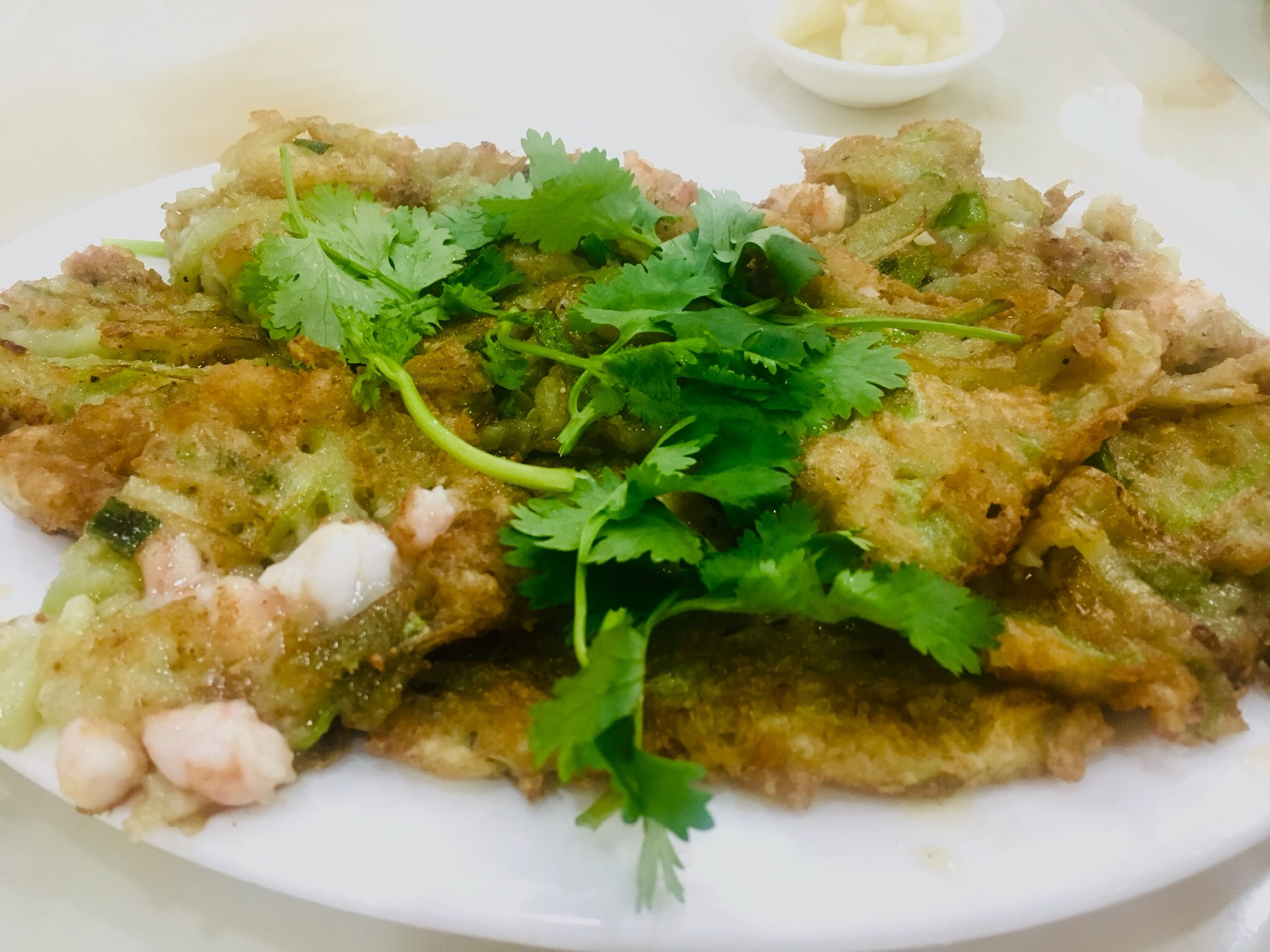 丝瓜鲜虾烙。是另一种味道的烙,蘸的是一种甜酱。味道挺特别的,值得一试。