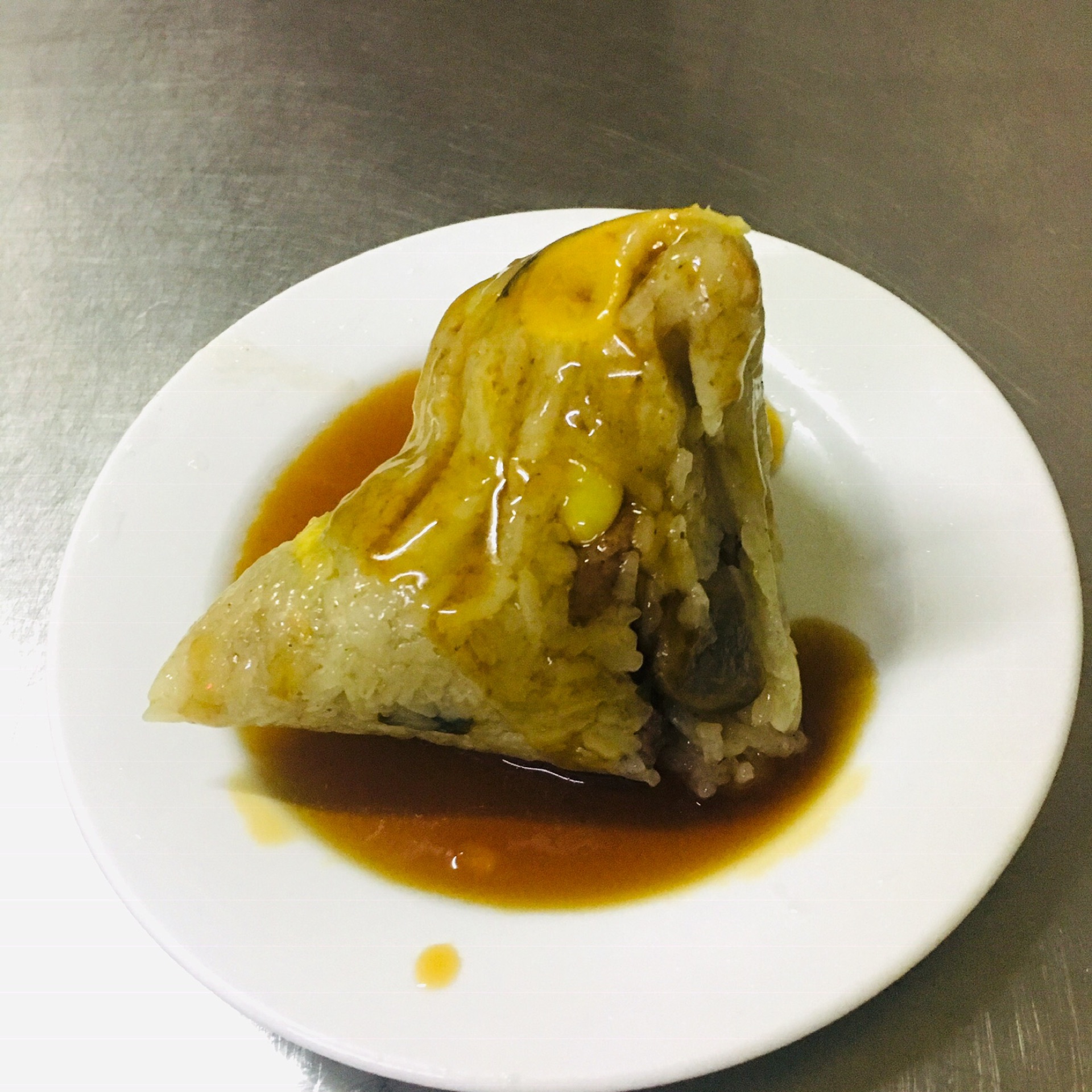 这就是粽球了。里面的料超级足,最神奇的是一边是甜的,一边是咸的。五个人吃了一个粽子,用了五双筷子。