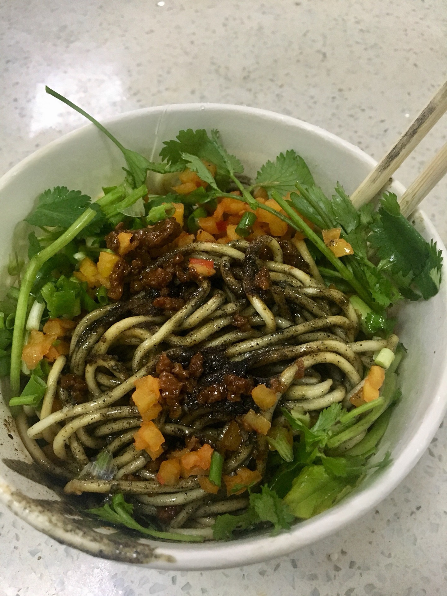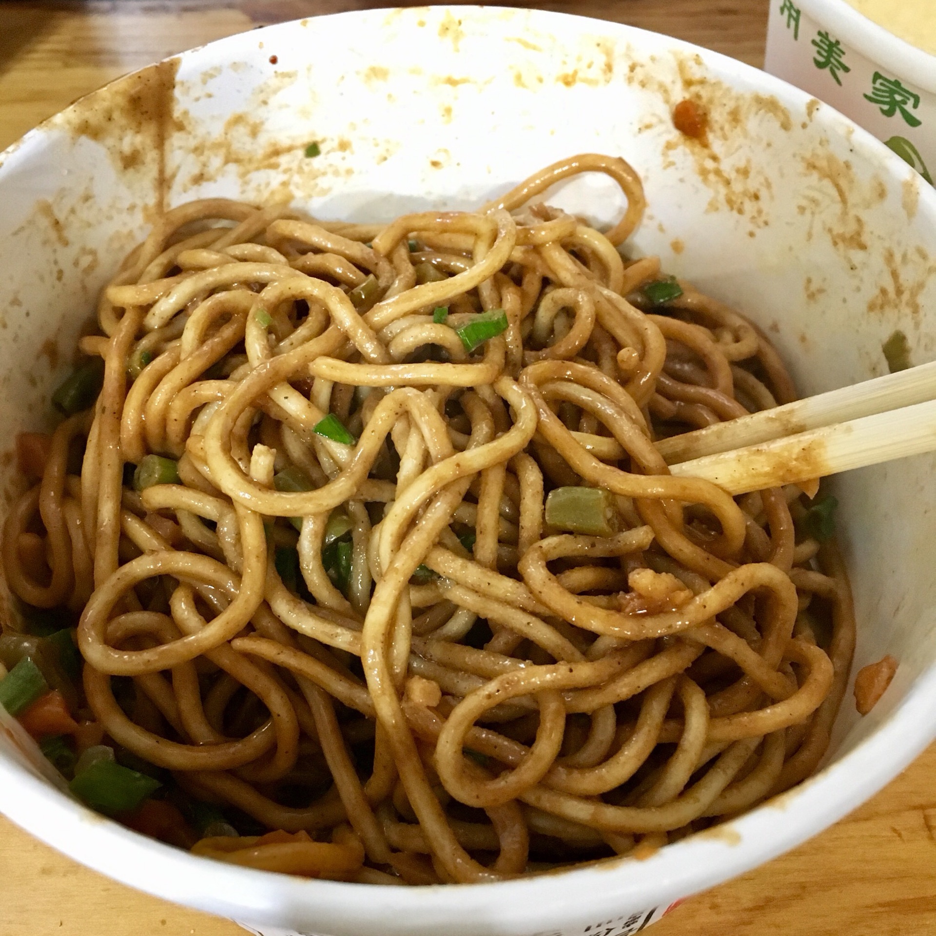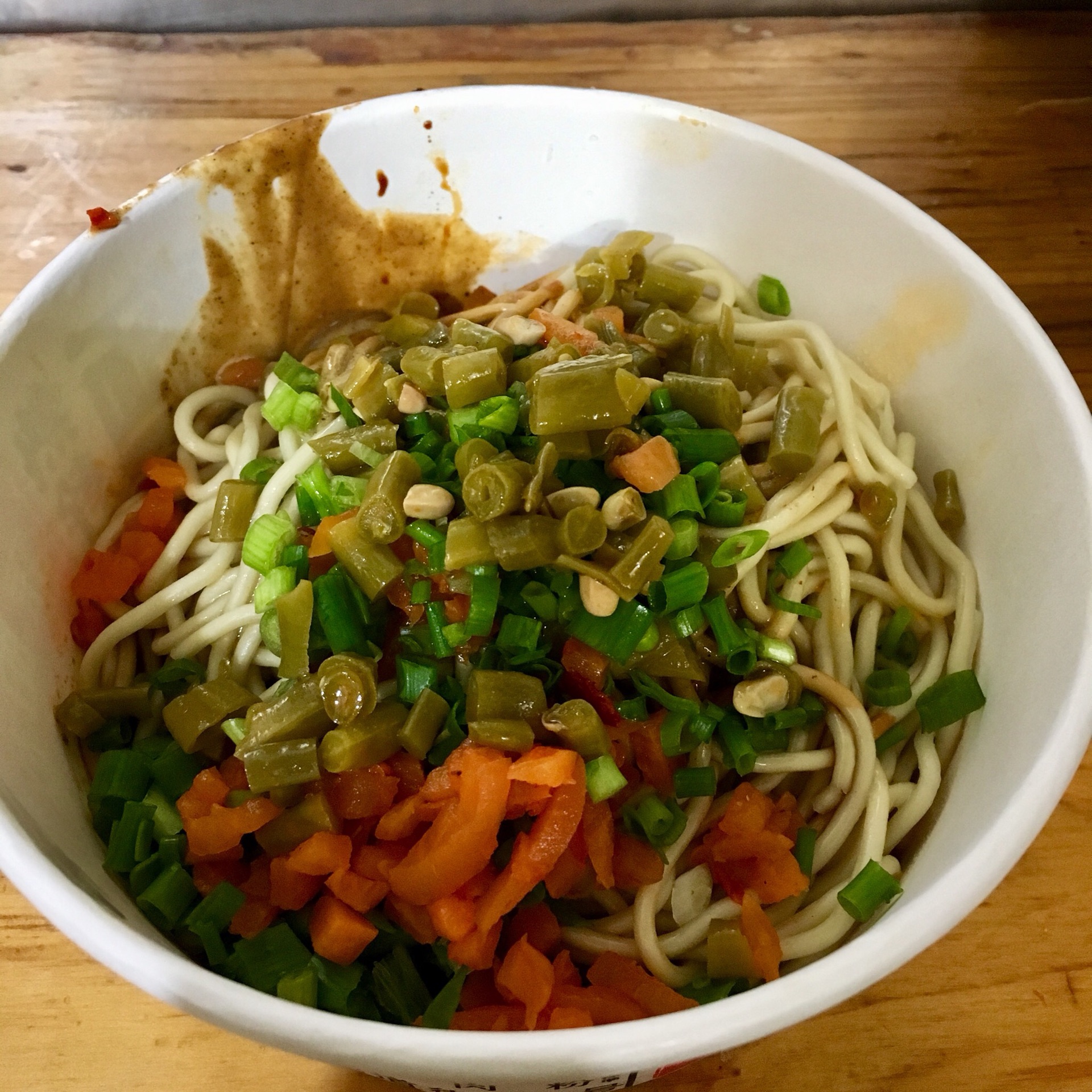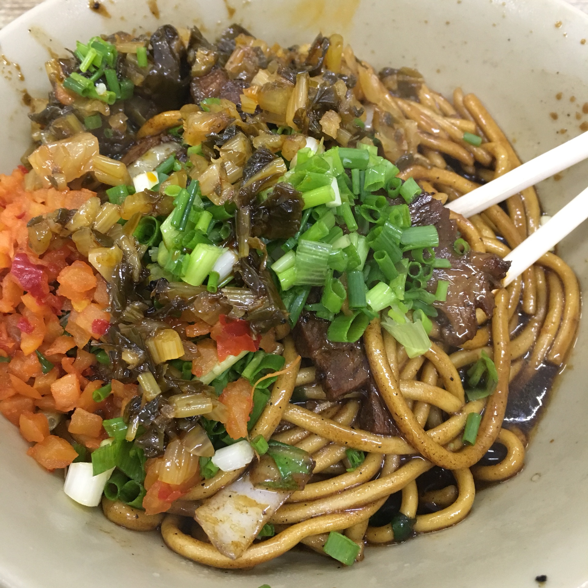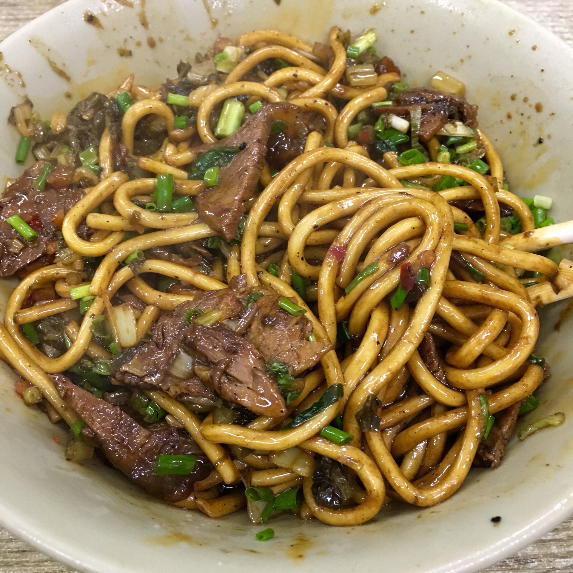 午饭时间人很多,炒面的阿姨动作倒是很利索,一般等不到十分钟就能拿到面。自己加了好多小葱榨菜和米醋,面条看着超级有食欲啊!!虽然油有点多,但是油多才香嘛。牛肉略有点咸,但是总体还是满意的!不过炒面量不是很大,感觉一碗吃完都没有很饱似的。