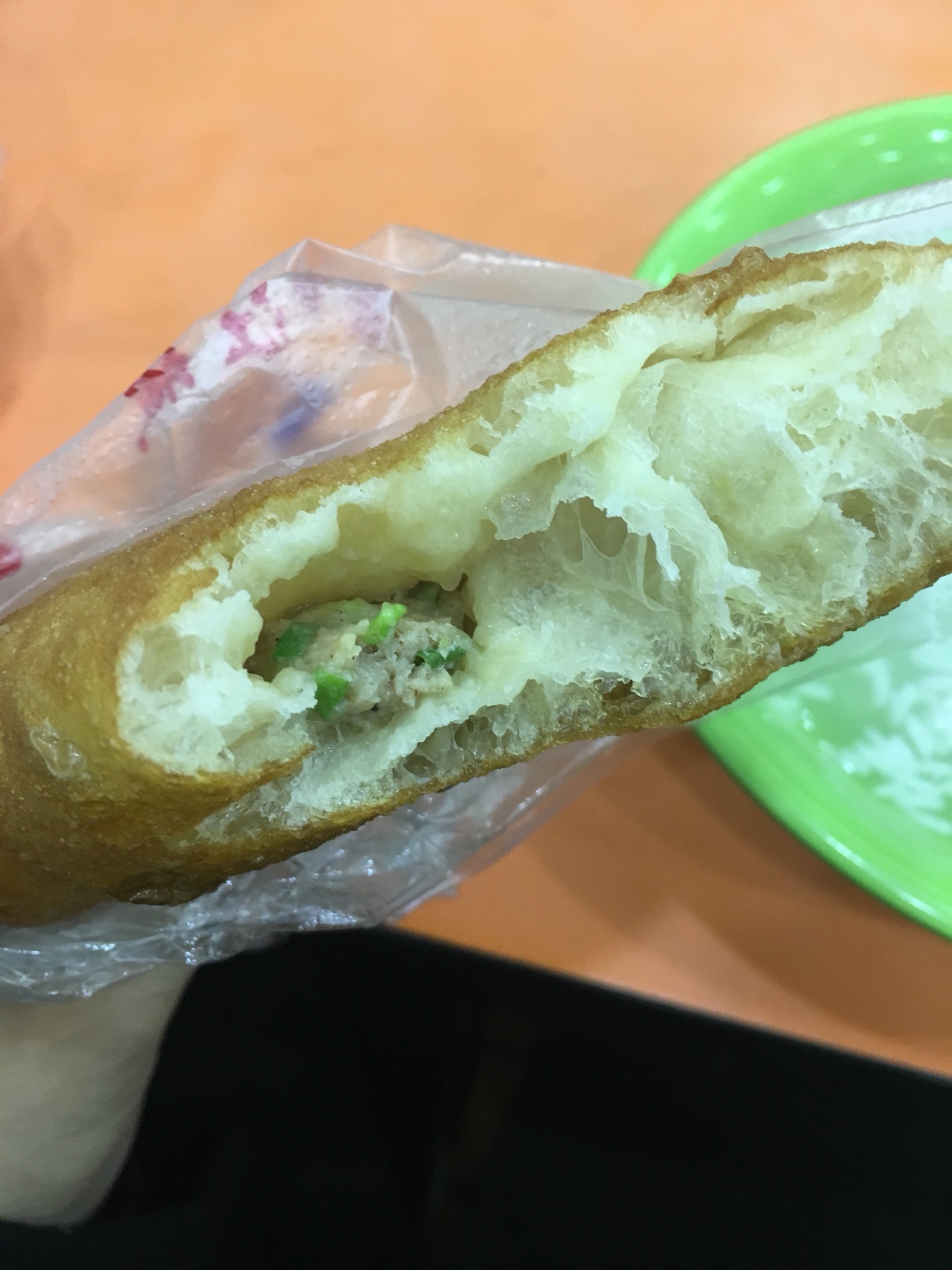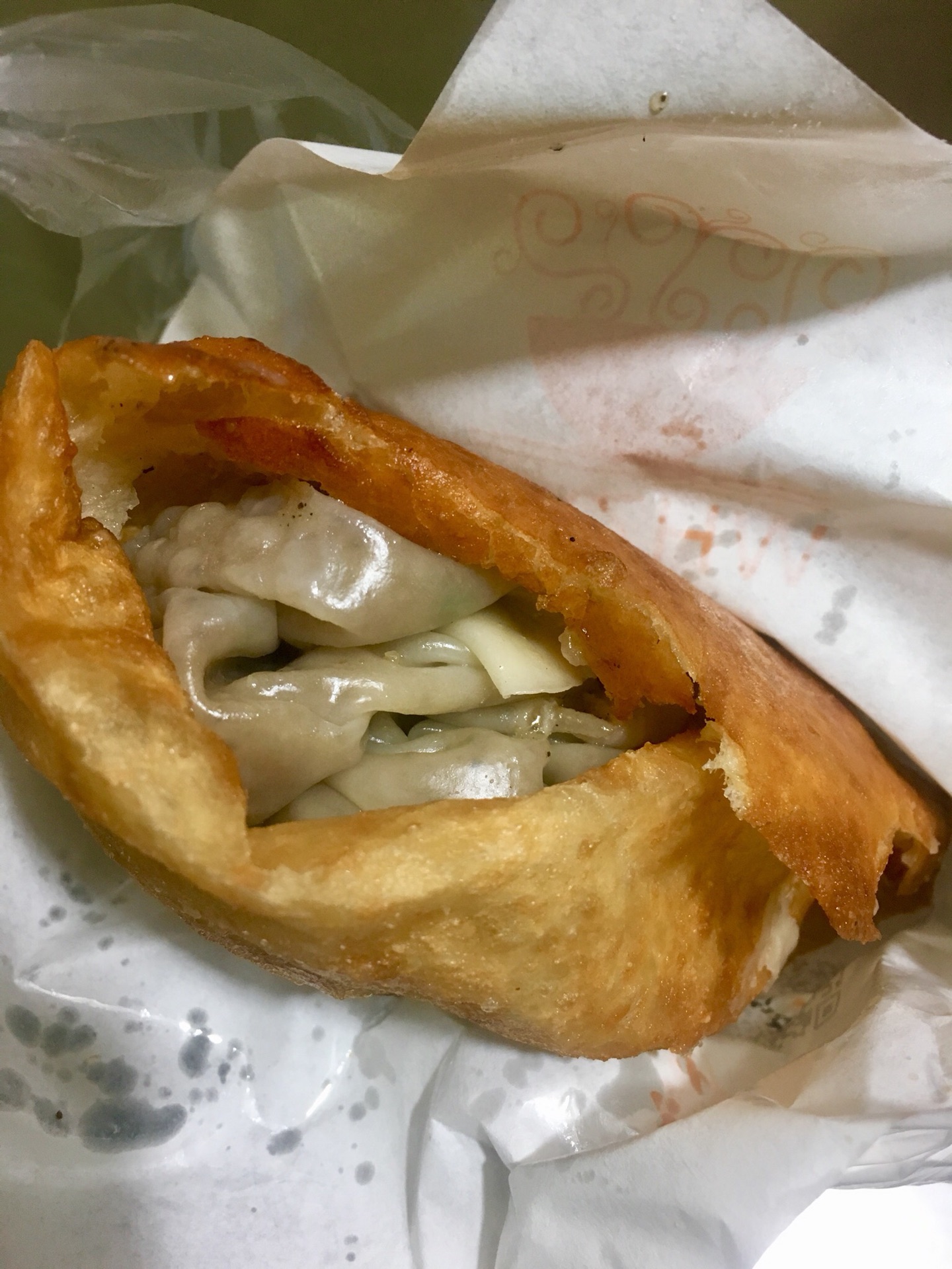 油饼酥脆,烧麦软糯,有浓重的胡椒味,能吃到大块的肉粒和糯米。两者结合味道很神奇,我喜欢。