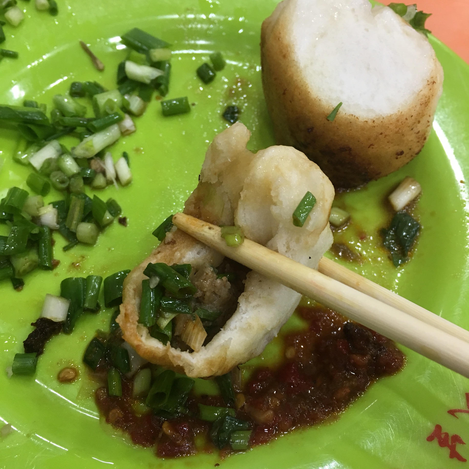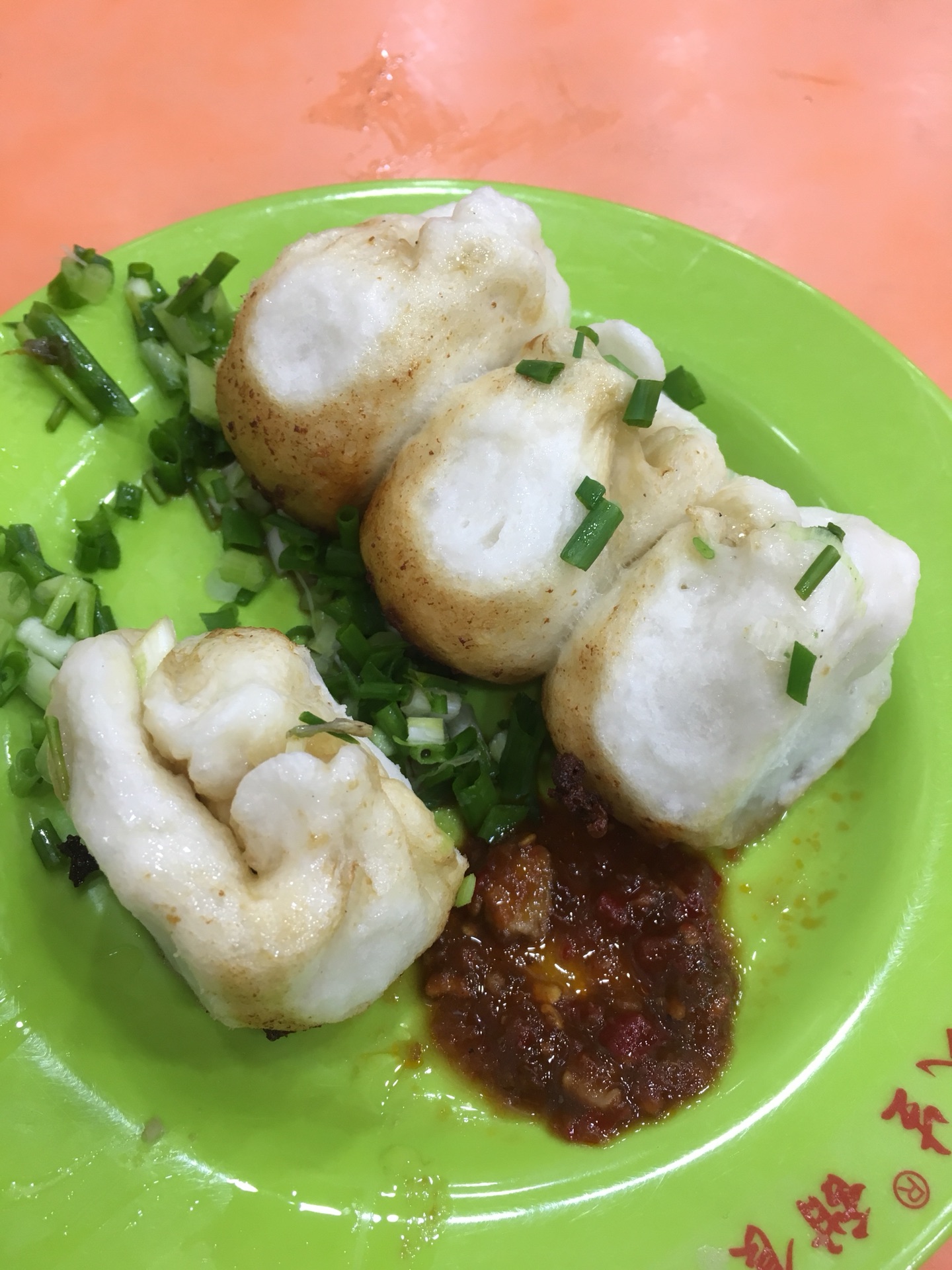 特色煎包,四个一份,看着软软的很喧乎,很想咬一口,味道就是中规中矩啦。不过煎包窗口旁边的那盆红红的酱,真是让我惊艳!!甜辣的口感,有豆瓣酱的味道。