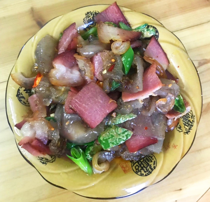 腊肉是砍成长块的新鲜猪肉抹上盐腌制以后挂在灶头或者专门的炕房熏烤而成,吃的时候先烧皮再清洗,可以做成炒腊肉(加上其他材料一起炒,如蒜苔、青椒、胡萝卜、土豆片、炸广椒、熏豆干、薇菜、洋芋粉粑粑、蕨粑等)、粉蒸肉、梅菜扣肉、土豆、萝卜或者海带炖腊排骨或者腊猪蹄,跟新鲜猪肉相比,少了腥气,多了熏香,口感也更好。