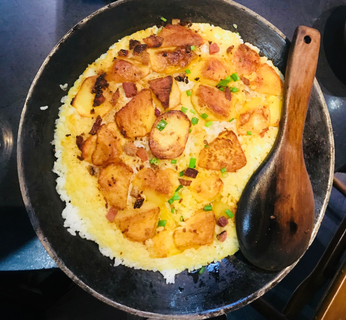 把土豆去皮切块,下锅加盐炒变色,均匀铺在炒锅锅底,倒上蒸好的米饭(或者生米),加水蒸熟,直到能闻到土豆的焦香味,跟锅接触的一面全是焦黄的锅巴,令人垂涎欲滴,部分餐厅会提供土豆饭做为主食。