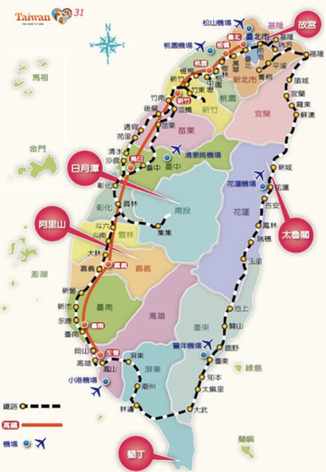 高铁只有台湾西部才有,东部没有高铁,只有台铁。台湾铁路除了最著名的纵贯线以外,还包括宜兰线、北回线、花东线、南回线等。