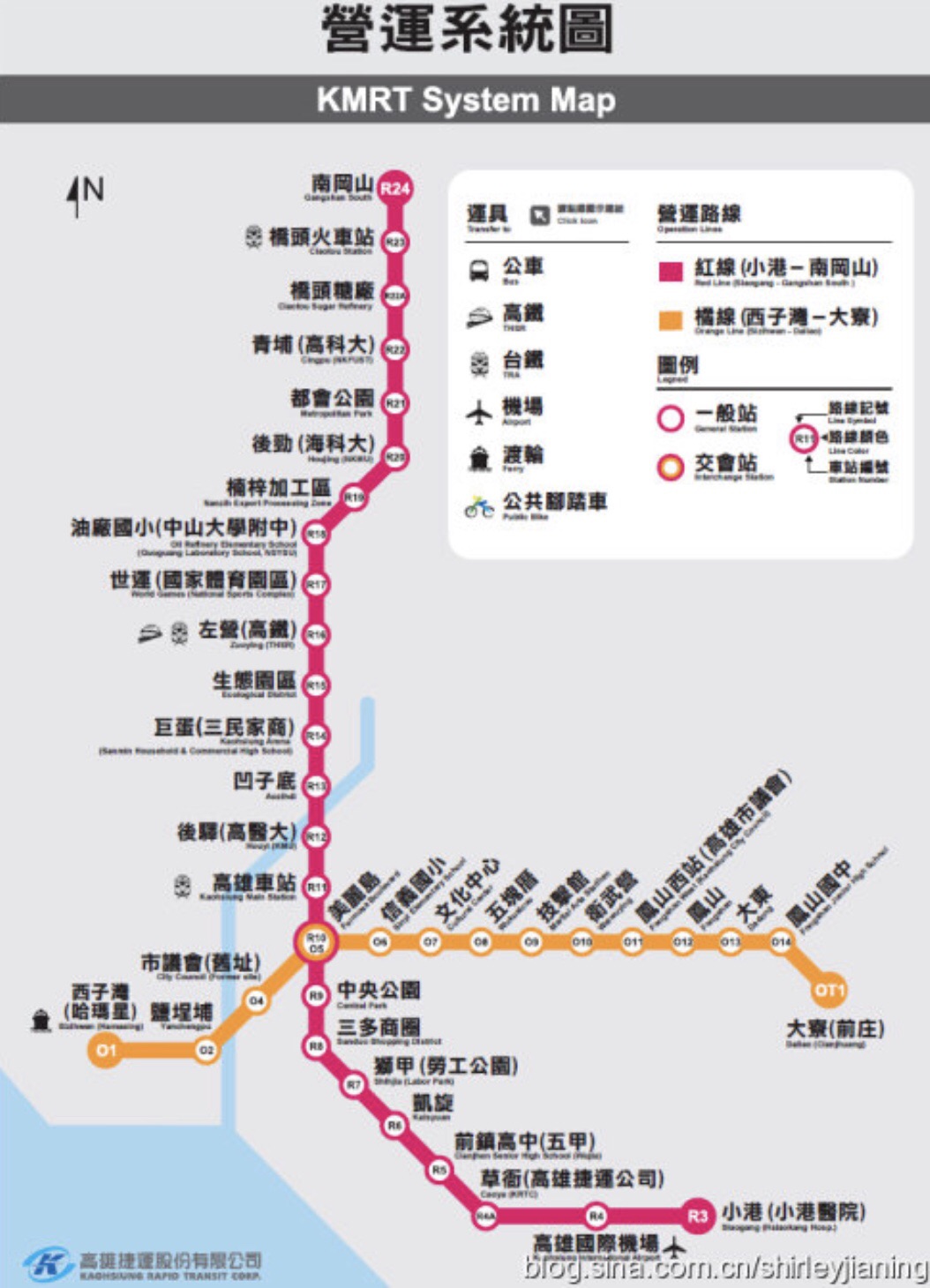 高雄是台湾省第二个建有捷运系统(MRT,Mass Rapid Transit)的都市。整个高雄捷运系统有高架、地下、平面等模式。目前有红线和橘线,另外还有数条路线(临港轻轨、蓝线、棕线...等)尚在规划中。