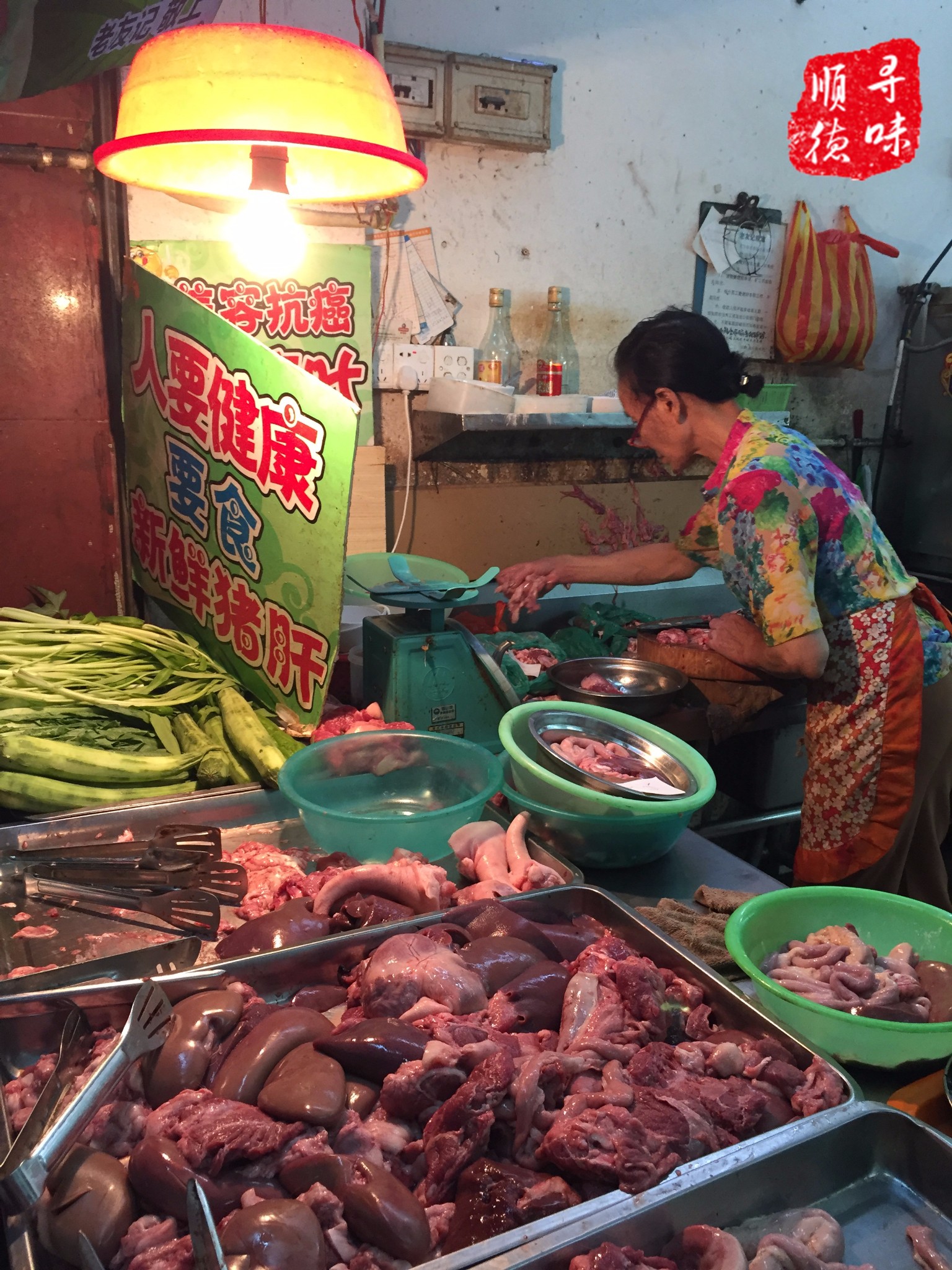 4个小时前才屠宰的各种新鲜猪杂,在灯光的照射下显得格外鲜嫩,