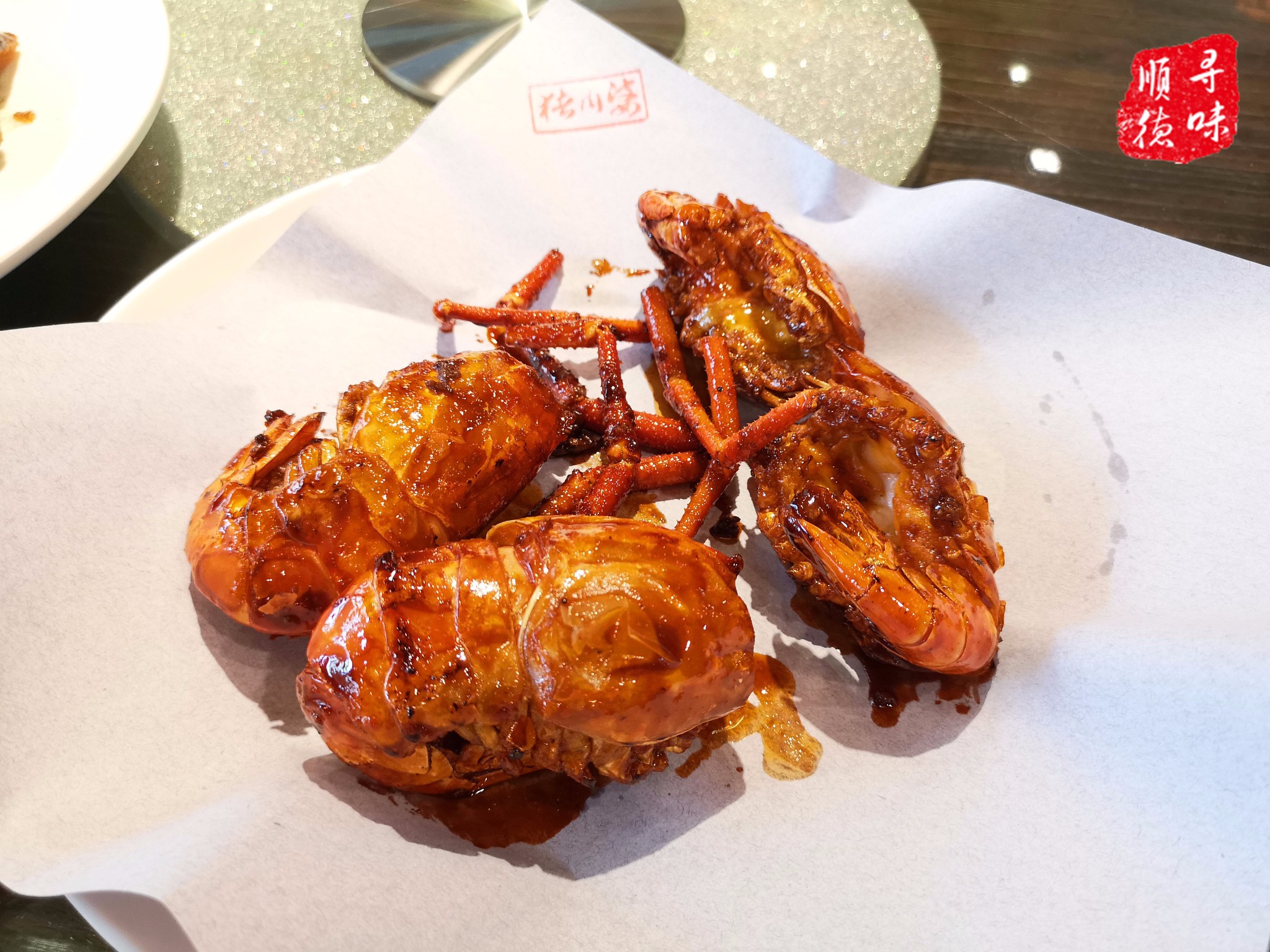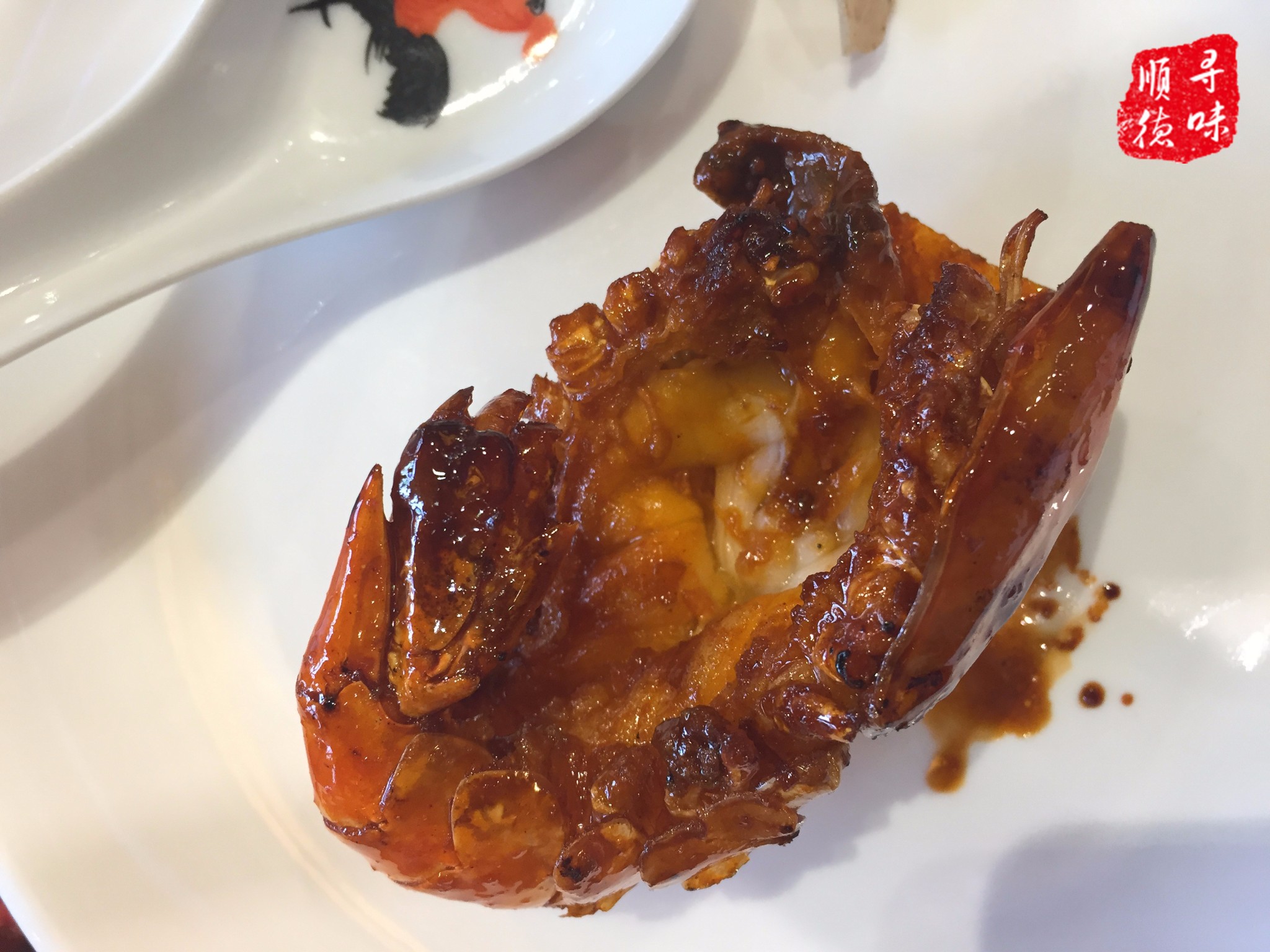 【美极干煎罗氏虾】,四只起点,按实际称重,感觉是一种介于小龙虾和基围虾的品种,甜咸味道的酱汁包裹住整只大虾,最特别的是虾头处焗了浓浓的芝士,虾肉饱满而充满弹性。