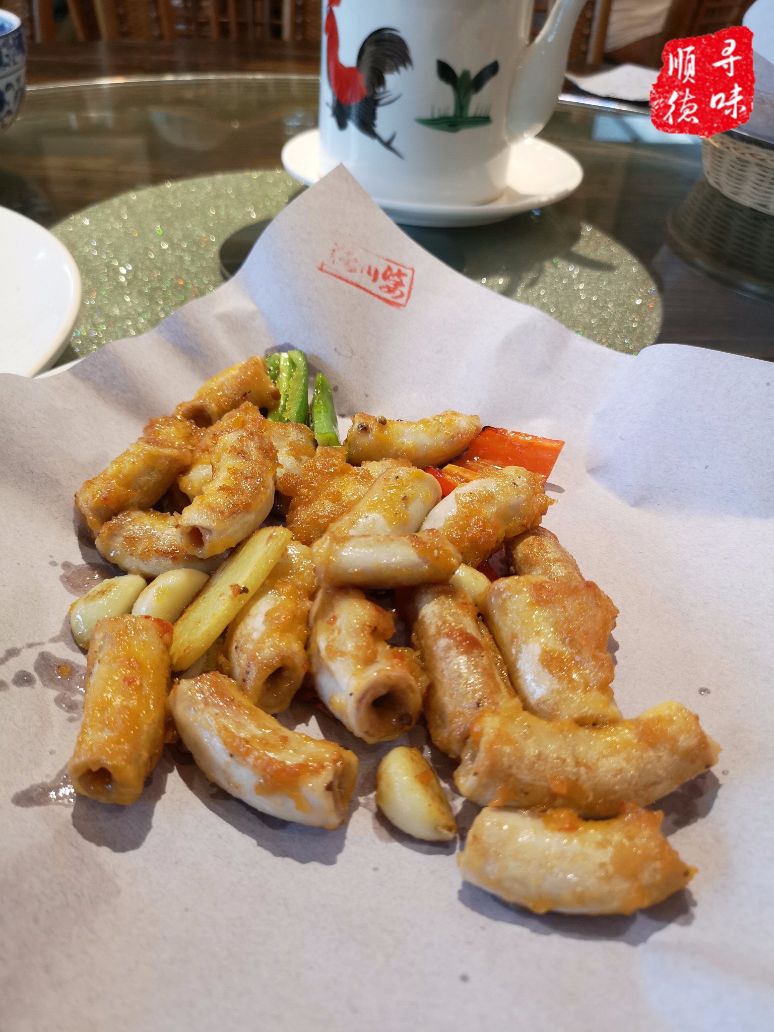 【煎焗竹肠】竹肠,其实就是猪肚出口的一小段猪肠,是顺德菜桌上的常客,口感脆脆的又带点嚼劲,煎过之后包裹了蒜香的味道,虽然特别,但作为外地人还是吃不太习惯。