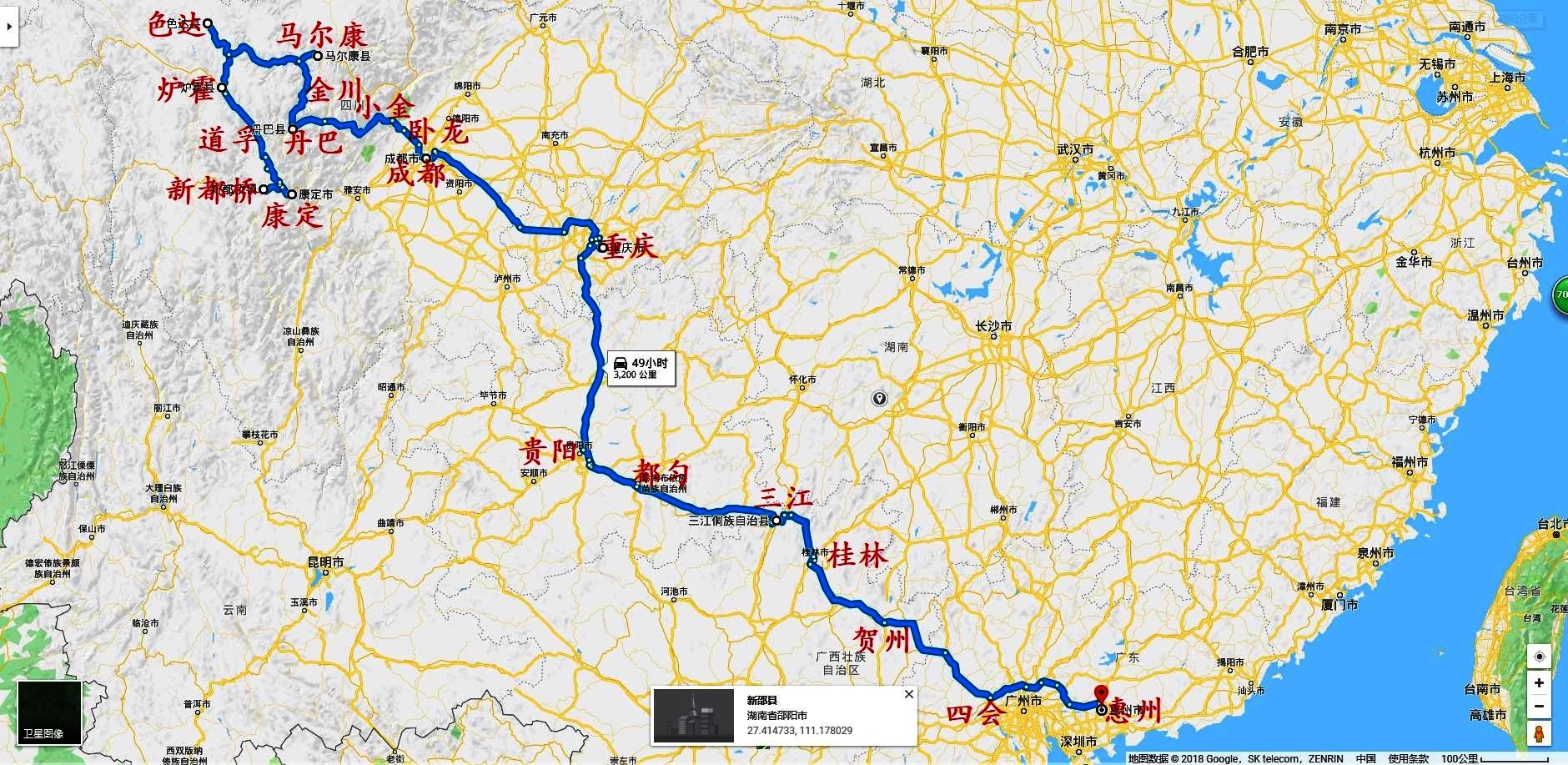 游览完亚丁胜境,到达新都桥,结束了我们六月的行程。7月1日从新都桥到康定。康定是四川甘孜藏族自治州的首府。康定在全国颇具知名度与那首脍炙人口的《康定情歌》密不可分。康定自古以来就是康巴藏区政治、经济、文化、商贸、信息中心和交通枢纽。同时是川藏咽喉、茶马古道重镇、藏汉交汇中心。从新都桥到康定途中翻越折多山。折多山是重要的地理分界线,折多山既是大渡河、雅砻江流域的分水岭,也是汉藏文化的分界线。翻过了折多山,就正式进入了康巴藏区。折多山最高峰海拔4962米,垭口海拔4298米,与康定市的海拔落差达1800米,是川藏线上第一个需要翻越的高山垭口,因此有“康巴第一关”之称。“折多”在藏语中是弯曲的意思,写成汉语就是“折多”;二字。折多山的盘山公路确实是九曲十八弯,来回盘绕就象“多”字一样,拐了一个弯,又是一个弯,故此四川人有句话叫:“吓死人的二郎山,翻死人的折多山”。但相对业拉山和觉巴山而言,折多山的路要好走很多。7月2日从康定到炉霍。再次翻越折多山,途中遇见一辆相向而行成都牌照轿车追尾,可悲的是年轻的司机命断折多山。从康定到炉霍途径康定机场、塔公、八美、道孚。沿途游览洛机普草原、塔公草原。7月3日从炉霍到色达。色达地处四川与青海交界处,当地人普遍信奉藏传佛教中的宁玛教,即红教。红色的寺院、僧众红色的衣帽,构成了“色达山河一片红”的景象。其中色达喇荣五明佛学院,依山而建的密密麻麻的红色小屋所构成的红色建筑群,着实令人叹为观止。色达还有东嘎斯、金峨寺、色达寺等著名寺院。7月4日从色达到马尔康。马尔康是四川省阿坝藏族羌族自治州的州首府,马尔康地处川西北高原南端,属高原峡谷区。是嘉绒藏族人的聚居地。7月5日从马尔康到丹巴。丹巴甲居藏寨是丹巴最具特色的旅游景区。7月6日从丹巴到成都,结束了我们川西高原之旅。7月7日成都修整一天,7月8日从成都直抵重庆,7月9日游览重庆。7月10日从重庆到贵阳,7月11日从贵阳到广西三江。7月12日从三江返回惠州,结束了我们为期58天的西行漫游。