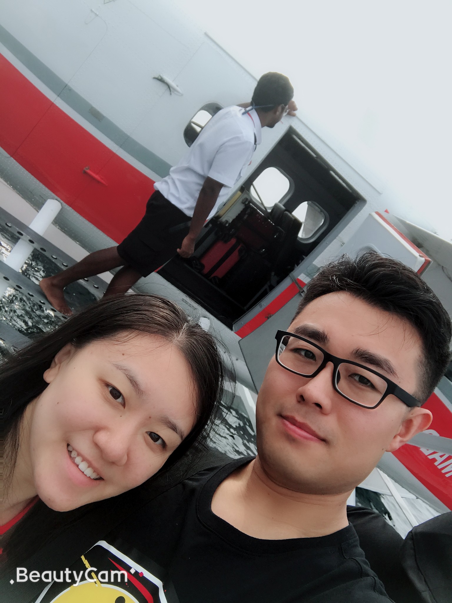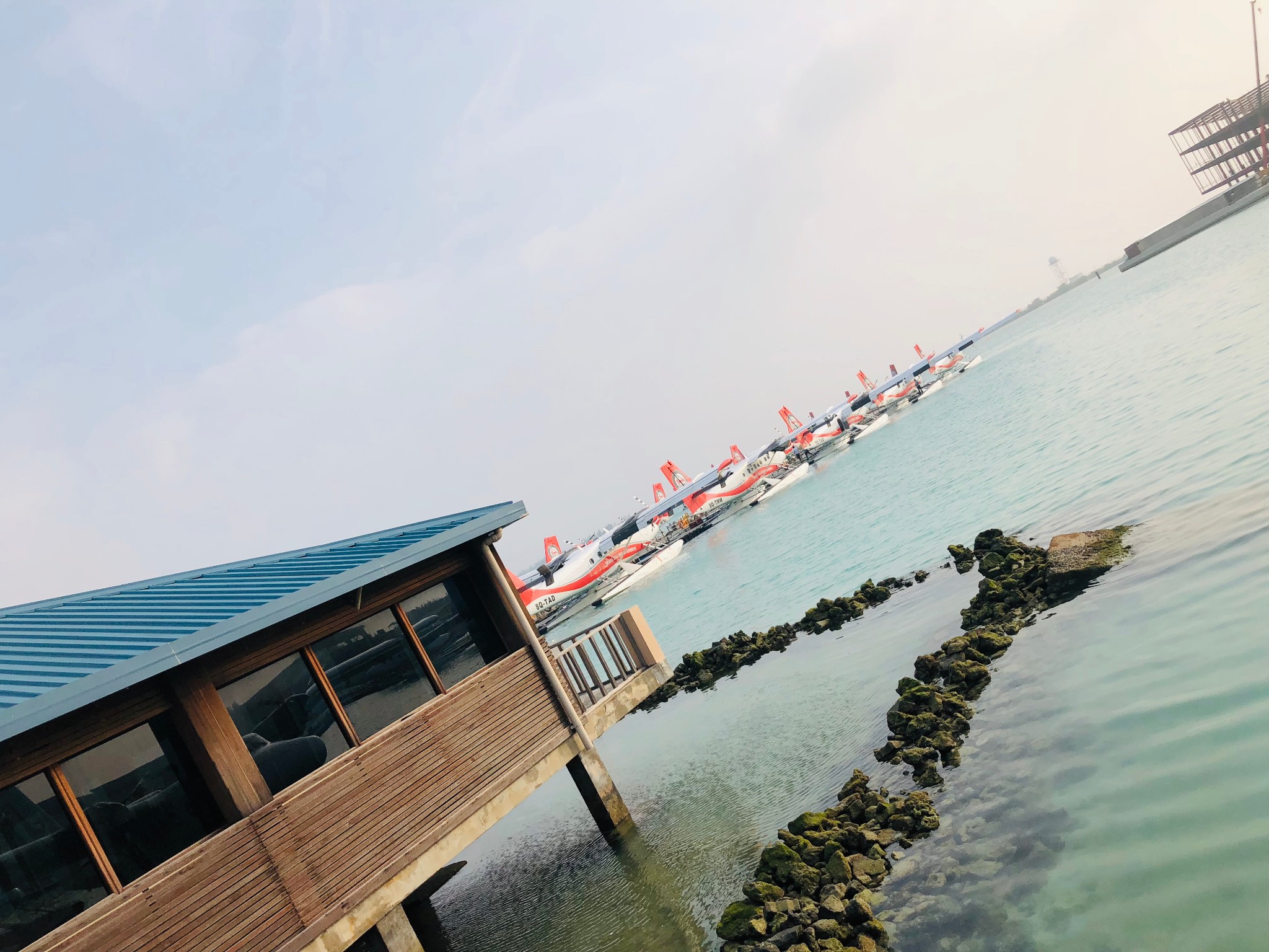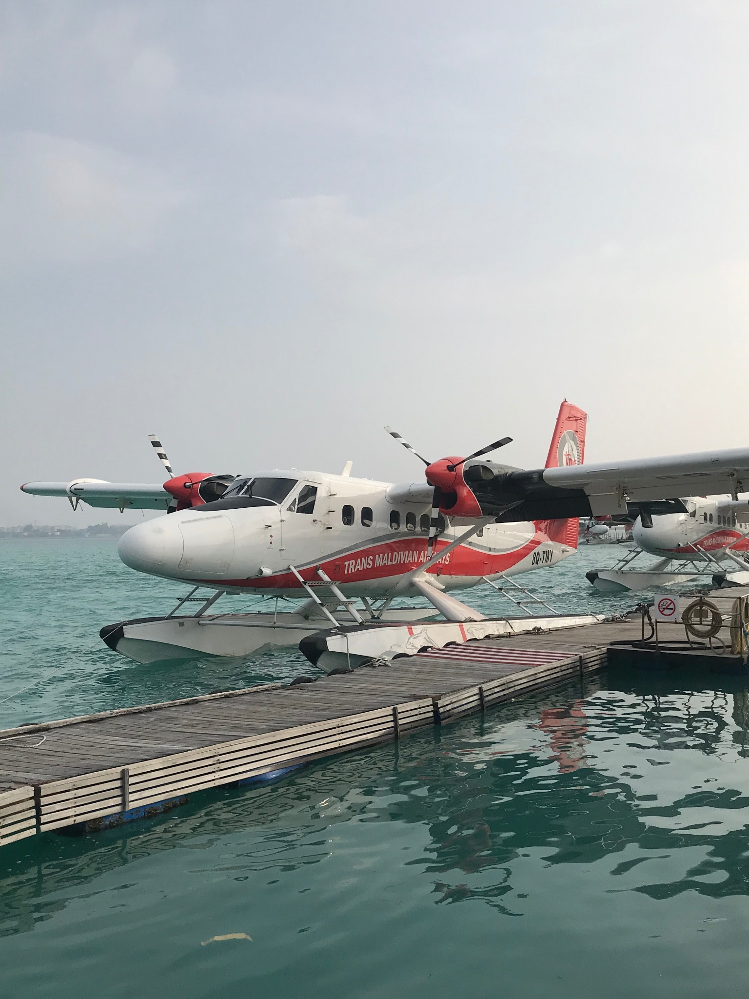 一睁眼还是黑天,一看手机才4点,国内已经7点了,生物钟就是这个点,自己就醒了,迷糊了一会,一会听见小黑敲门,告诉我们提前了,6点30吃早饭,7点出发去机场。我和媳妇洗漱完了拿着行李就下楼吃早饭了~早饭是小黑自己做的,1枚煎蛋、1根烤肠和两片面包配上黄油和草莓酱。和小黑交谈,知道他是从印度来打工的,现在26岁,还没有对象哈哈,反正就是家常闲聊,英语水平有限,我们都是边聊边笑似懂非懂~很快接我们的车就来了~拉着我们一起到了机场,小黑让我们在指定柜台等待,然后他就走了~柜台前陆续来了几个人,看来都是今天一起上岛的~都是中国人哈哈哈~柜台小黑核对完我们信息后就领我们去寄存行李,打印水上飞机登机牌,然后小巴车拉着我们一行10个人驶往水上飞机场。