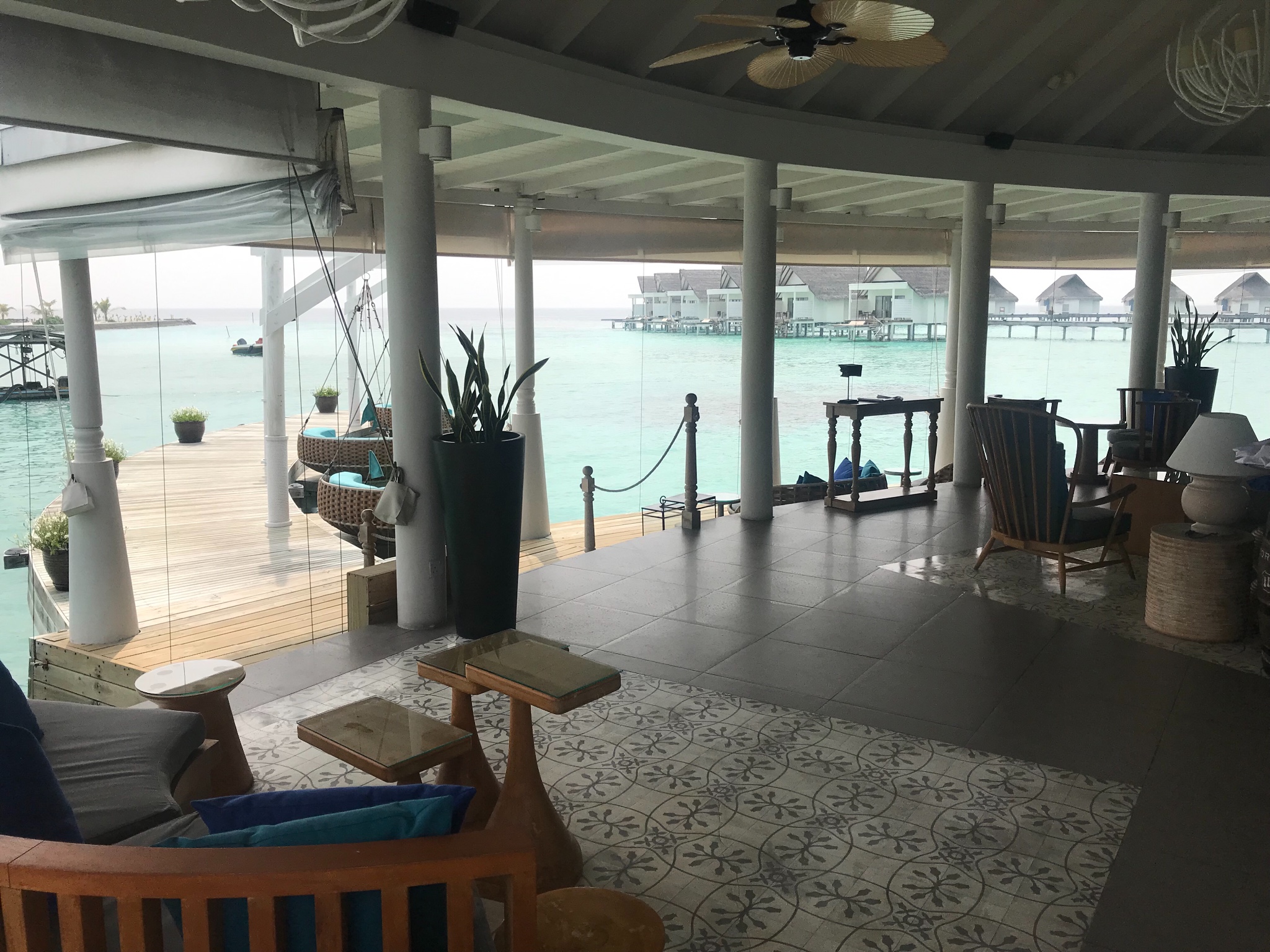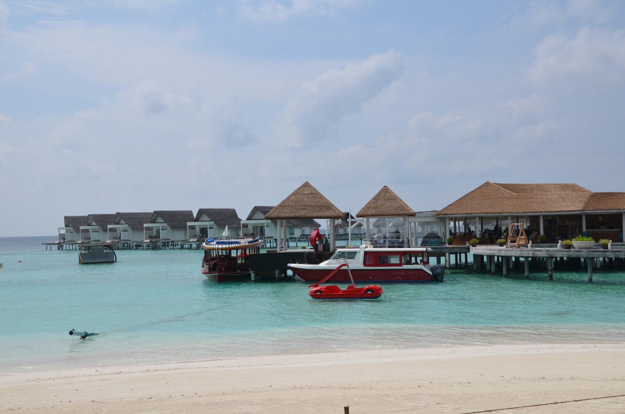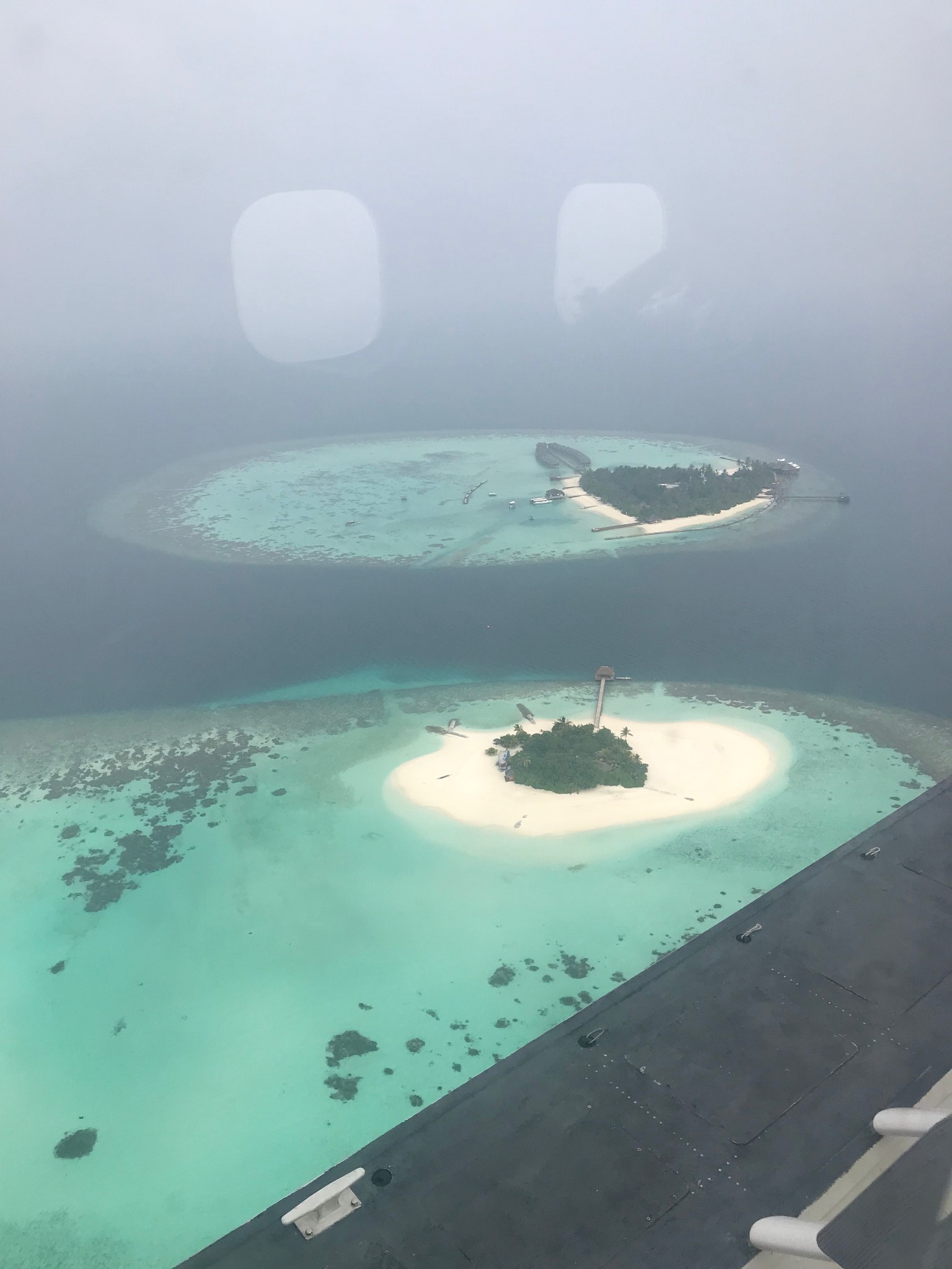 大约30分钟左右我们开始下降,降落在靠近中央格兰德岛附近的一个浮排上,全程不需要自己拿行李,由机组成员将我们的行李从水上飞机搬下来并逐一和我们核对,确认无误后很快就有快艇来接我们上岛,快艇上有中文服务的大姐~对于英语不好的小伙伴完全不需要担心,中央格兰德岛一直会有中文前台服务~~真是很贴心~~安全抵达后,前台水吧先安排我们坐下休息,为我们准备了擦拭的毛巾和软饮