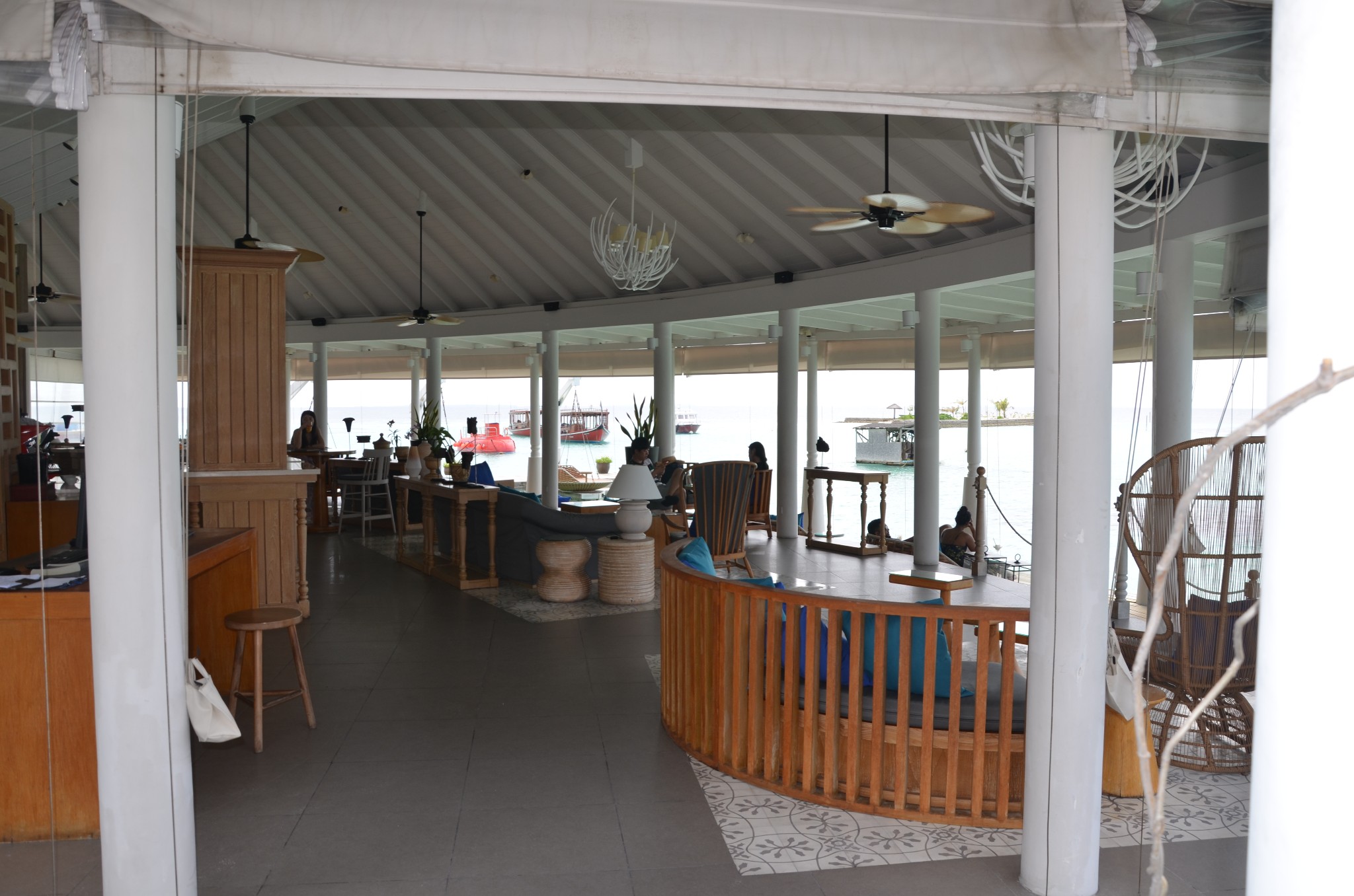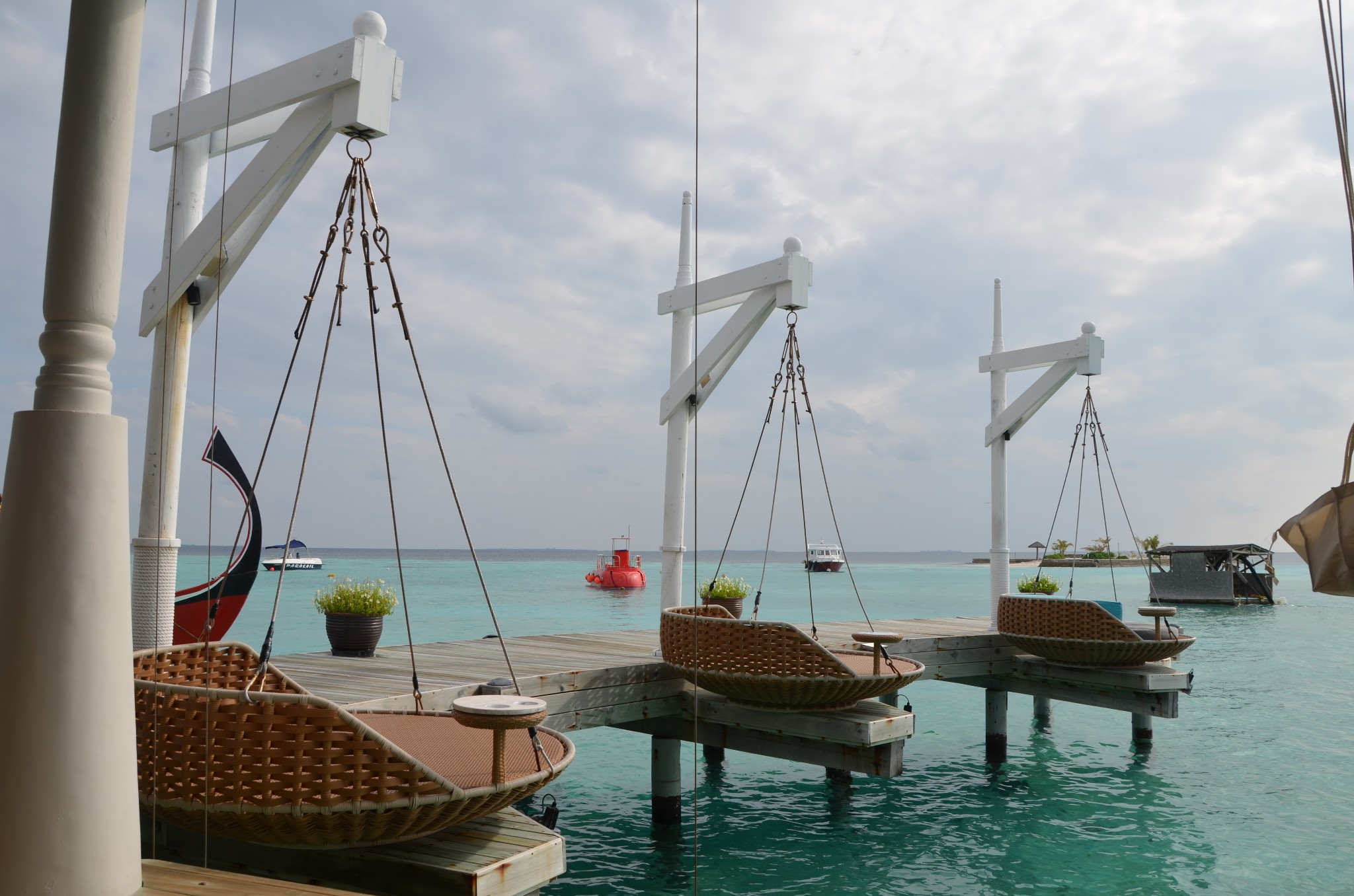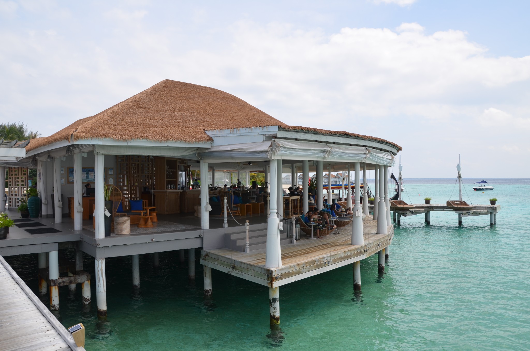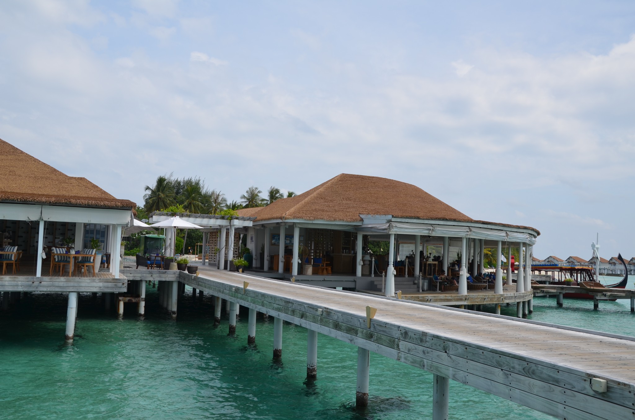 大约30分钟左右我们开始下降,降落在靠近中央格兰德岛附近的一个浮排上,全程不需要自己拿行李,由机组成员将我们的行李从水上飞机搬下来并逐一和我们核对,确认无误后很快就有快艇来接我们上岛,快艇上有中文服务的大姐~对于英语不好的小伙伴完全不需要担心,中央格兰德岛一直会有中文前台服务~~真是很贴心~~安全抵达后,前台水吧先安排我们坐下休息,为我们准备了擦拭的毛巾和软饮