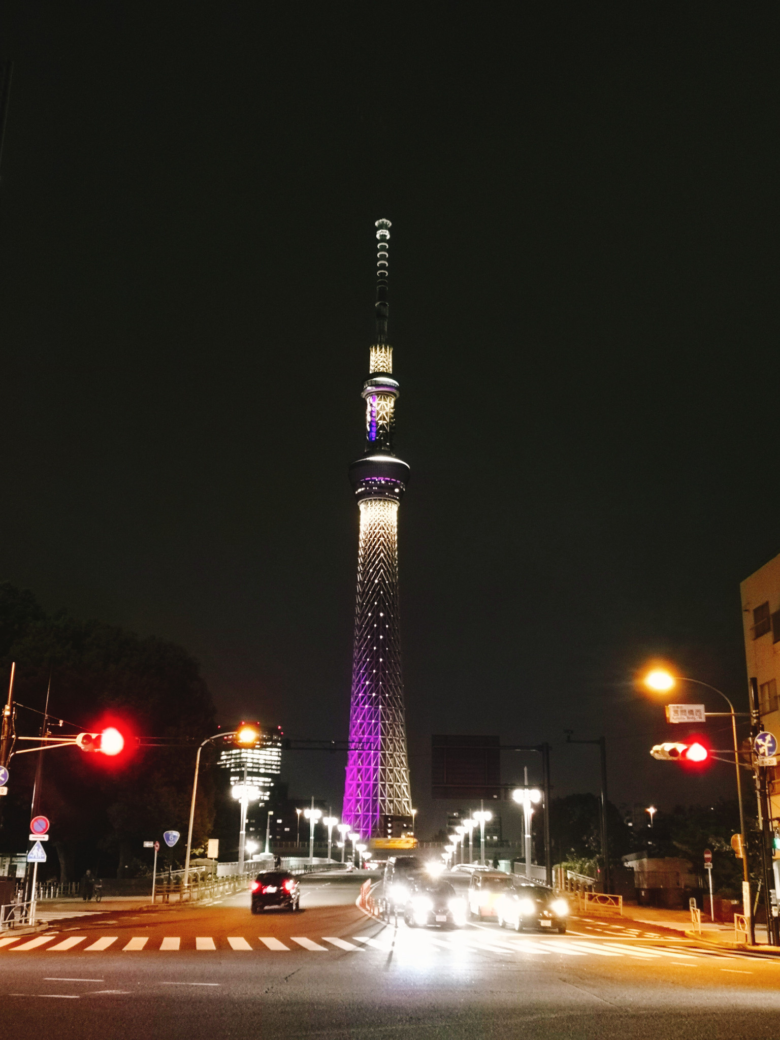 冲洗完一身的疲惫,拉开酒店的窗帘,惊喜的发现窗外就是东京天空树,有着日本第一高的展望台。塔身的灯光在浅绿、淡紫之间变化,非常好看。