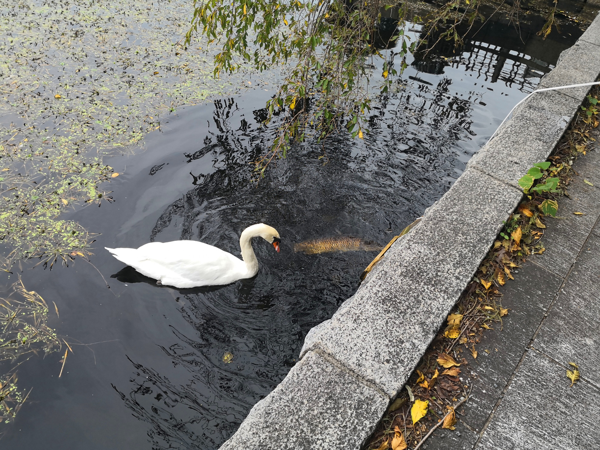 护城河里养了白天鹅、黑天鹅和鱼(鱼挺肥美的样子