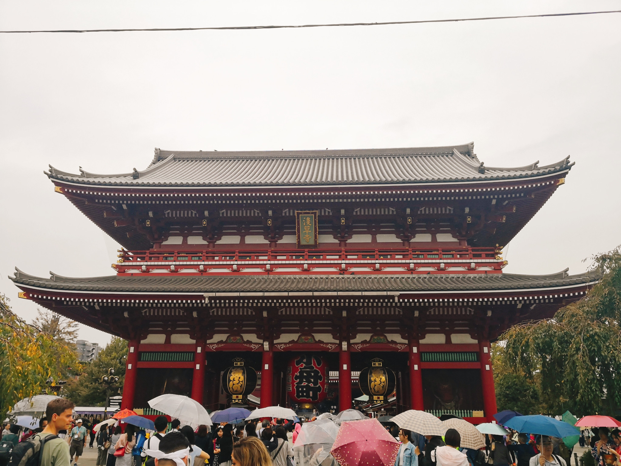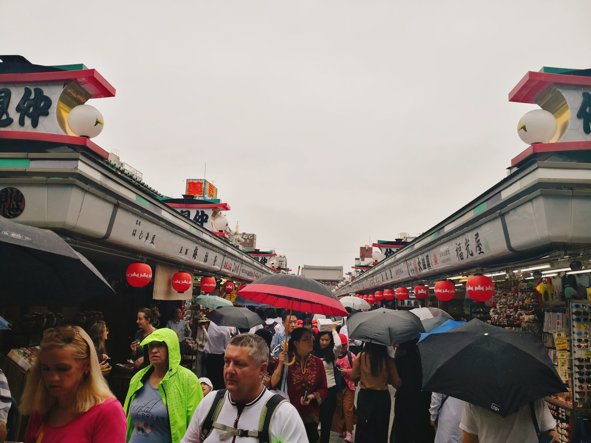 仲见世商店街,位于浅草寺的雷门和正殿之间,是日本最古老的商业街之一。两边有着90多家商铺,贩卖各种纪念品和小吃。虽下着小雨,但也是熙熙攘攘,人头攒动。