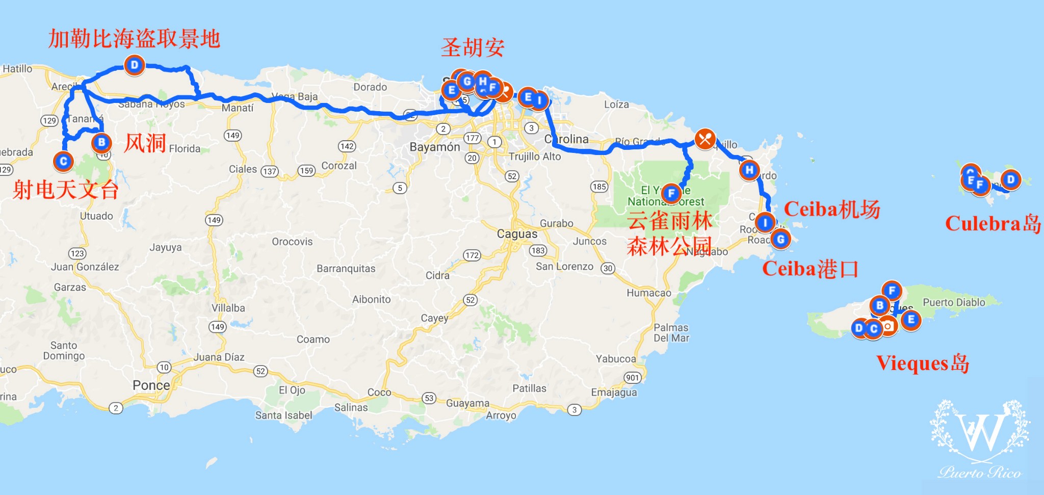 去之前也在担心17年飓风Maria对Puerto Rico的影响,问了一些周围去过的朋友也看了很多大家的游记都说已经基本恢复。去过之后感觉飓风影响确实还存在但已经不大。比如,云雀雨林国家森林公园中一些道路和景点依然封闭,仍在修复之中;据当地人说Vieques岛荧光海滩的亮度已经恢复了80%以上。可能此次我们所见到的波多黎各并不是他最完美的样子,但也足够惊艳。