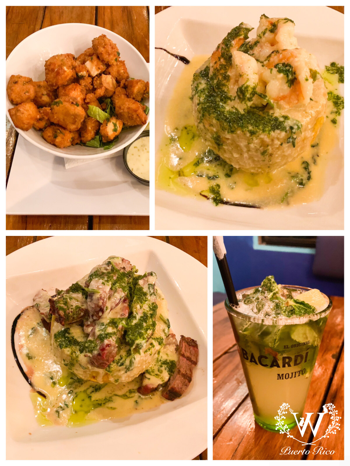当晚我们去了很多游记推荐的位于老城区的Punto de Vista Rooftop Restaurant,是一个酒店的顶楼。服务员告诉我们如果想坐在外面的露台需要等一个多小时,由于我们到的时候已经天黑,去露台看了一下觉得也没什么夜景值得看,所以就选择在室内用餐。晚餐点了mahi-mahi bites,shrimp mofongo和beef mofongo。他家的mofongo开始吃感觉还可以,后面越吃越噎。所以后面几天都避免点mofongo,不过临走前我们去别家又点了一次,感觉比这家做的要好。