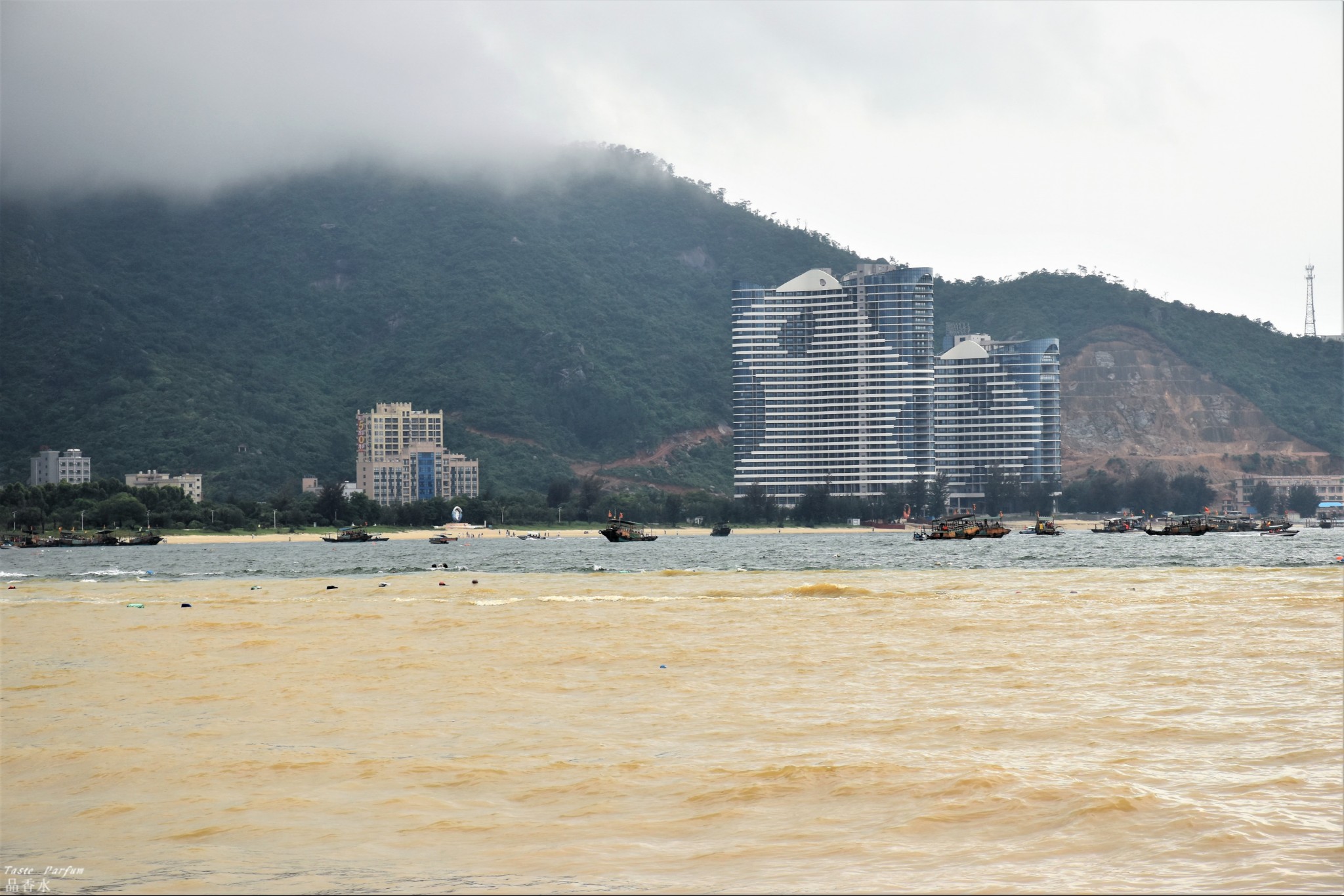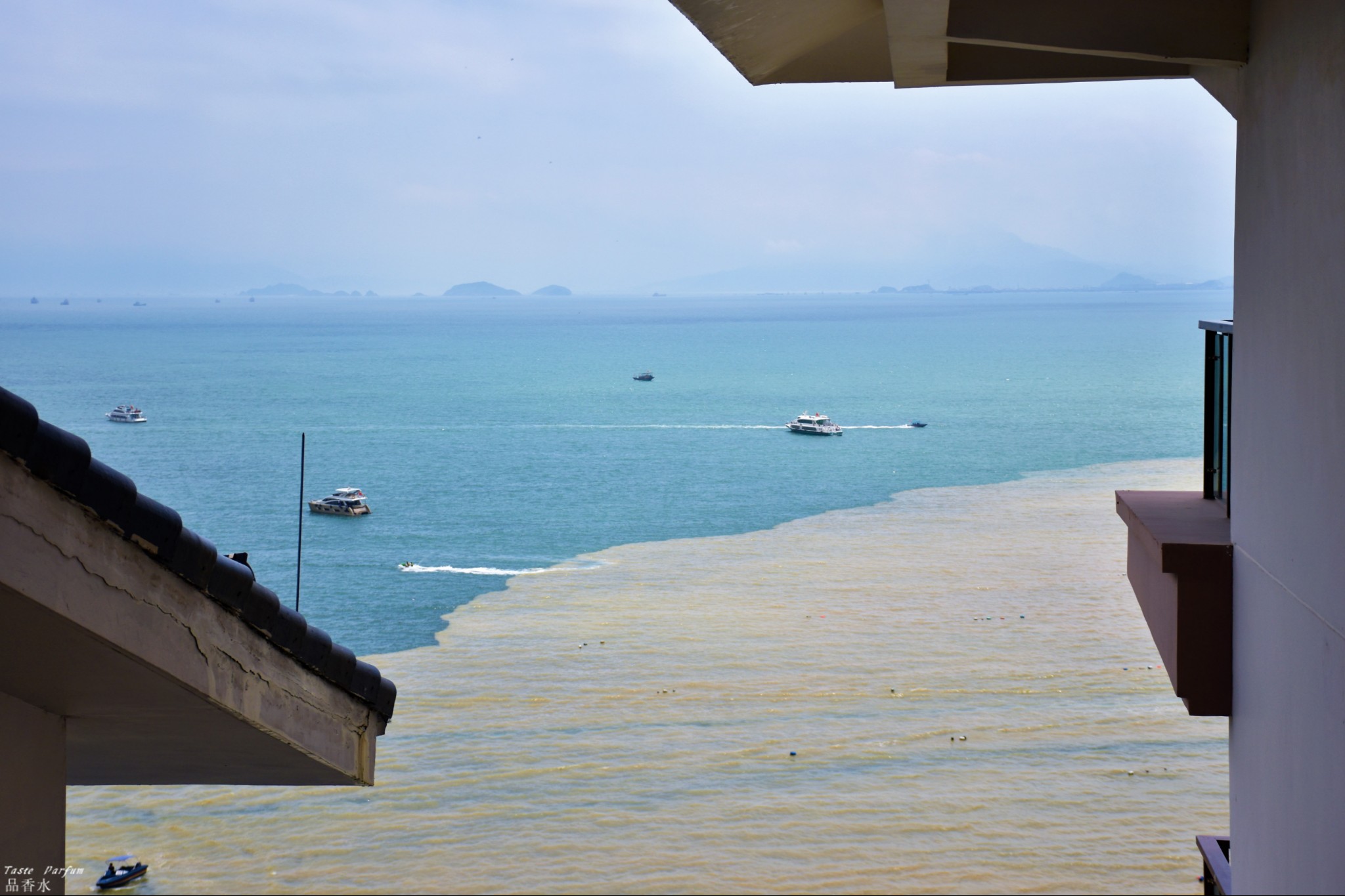 大海成了鸳鸯锅被分成两个颜色,远处仍是一片碧蓝,近处靠近沙滩的海水是黄色的。