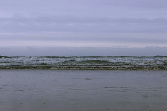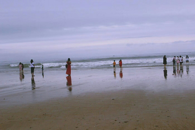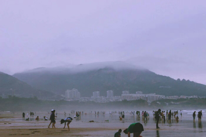 第二天,雨,吃完饭送她们去酒店。一个人走路去海边。云压的很低,海水微凉。沙滩上运草车来来往往,人群左躲右闪。
