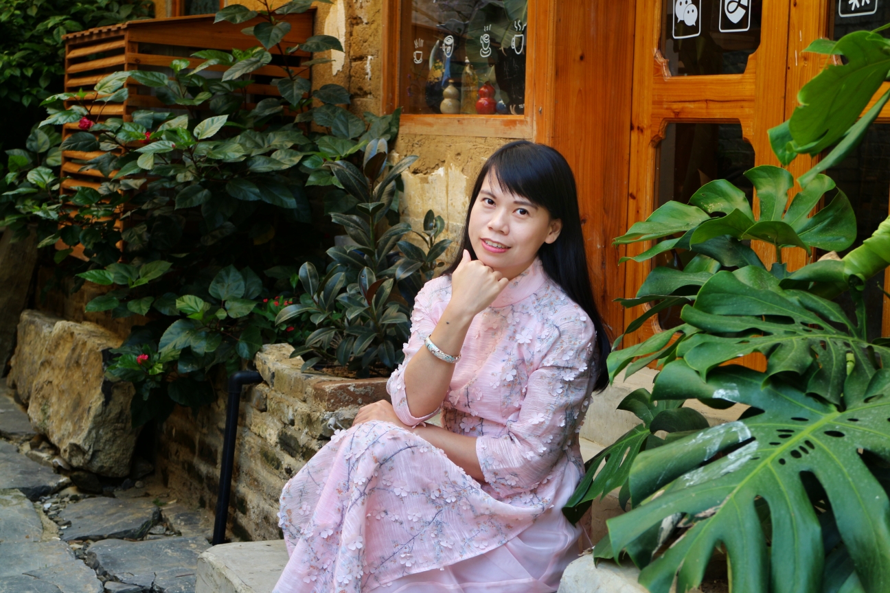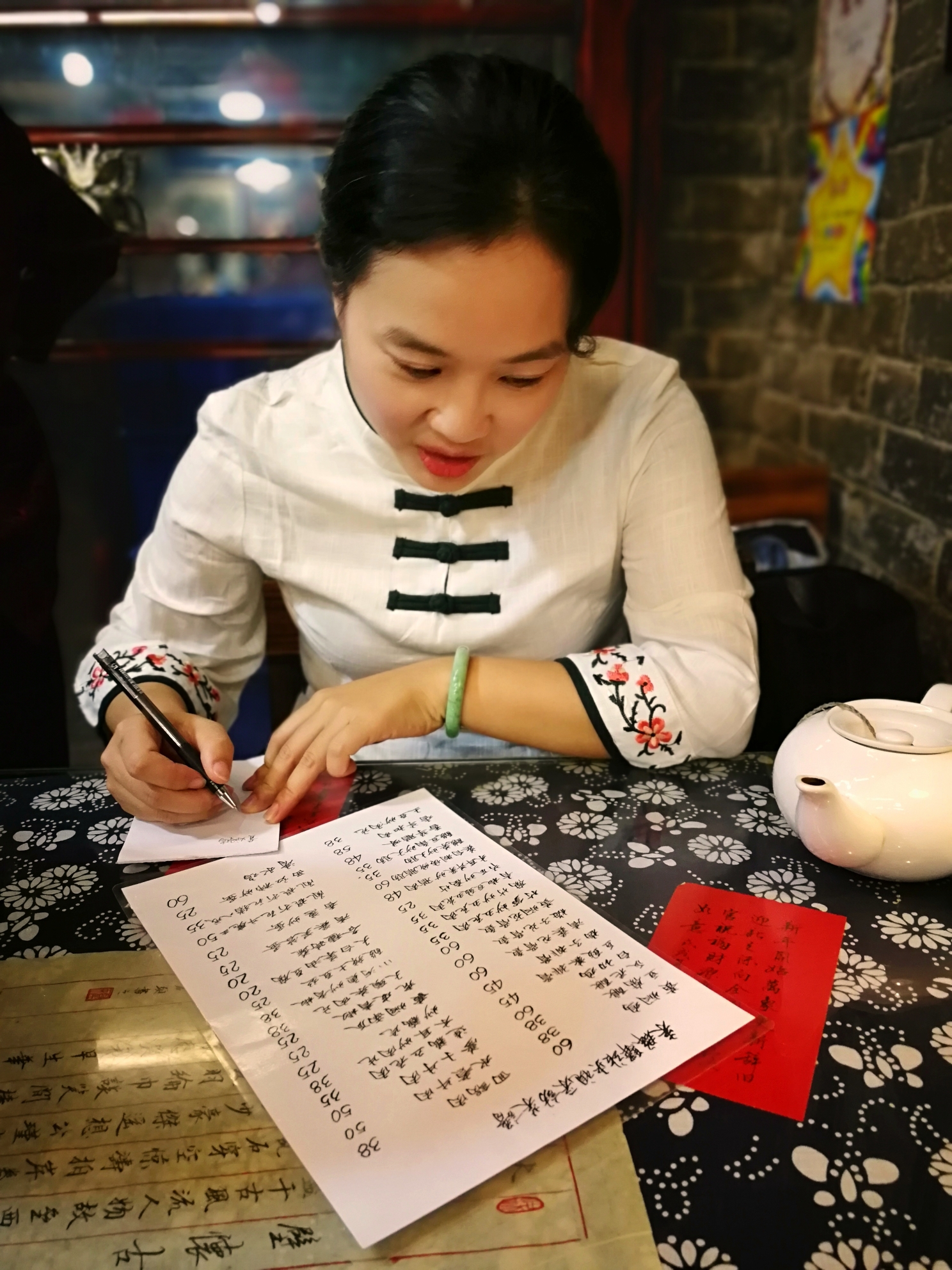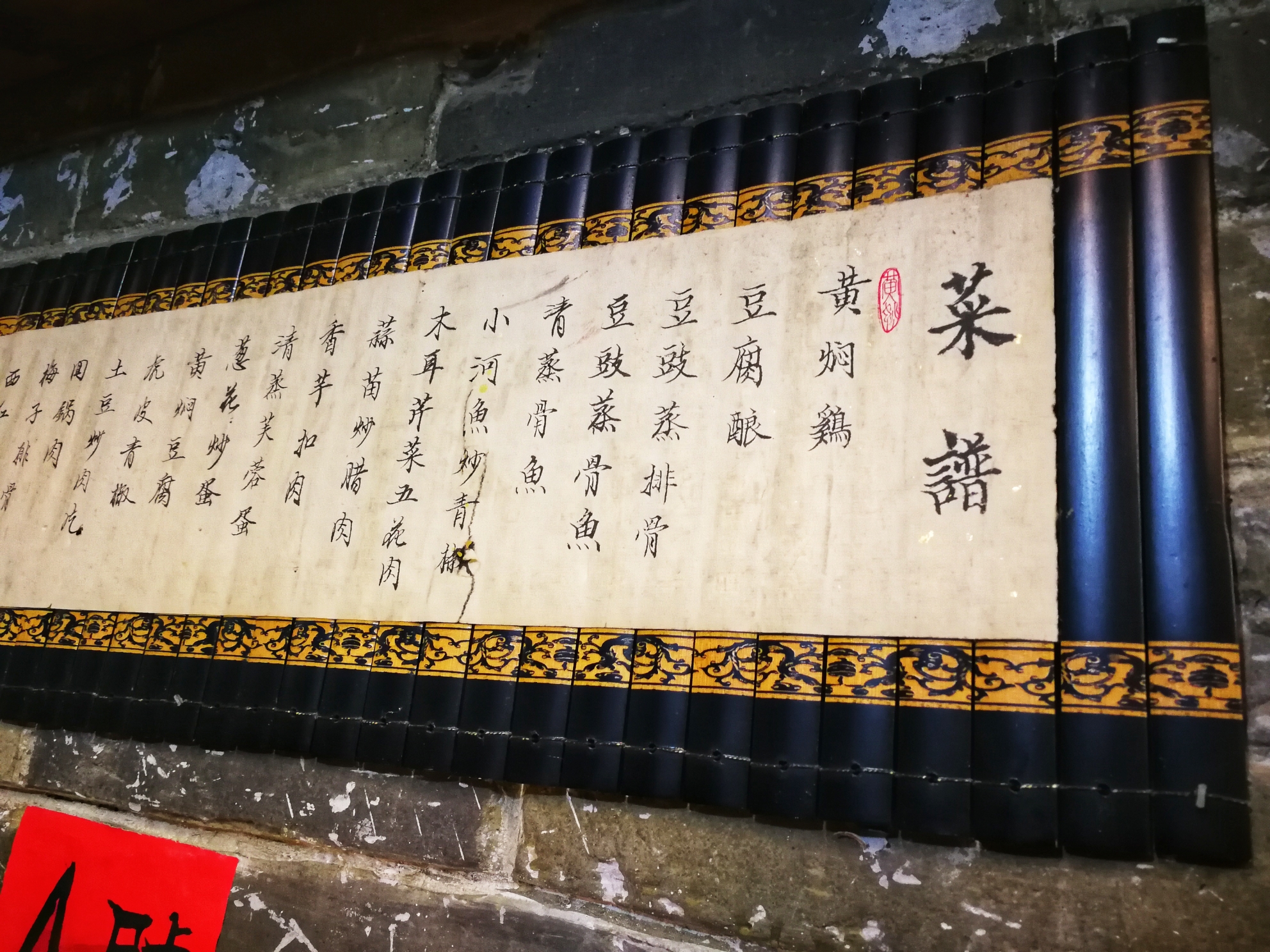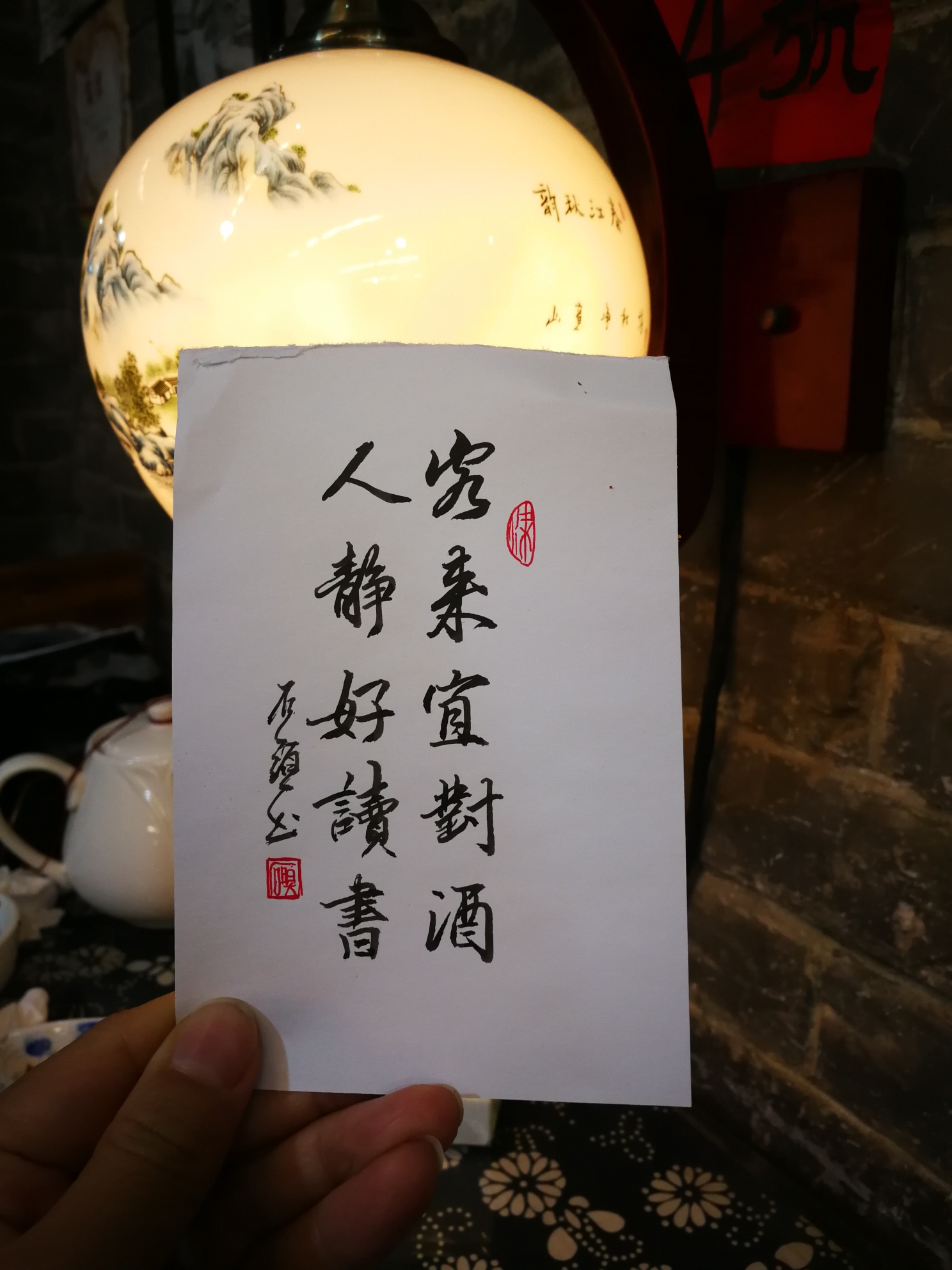 十月的黄姚,太阳还是火辣辣的,下午我们乖乖躲在客栈休息。四点多,我很负责任叫醒两位小伙伴,一轮梳妆打扮少不了,磨磨蹭蹭一轮,可怜教授的旗袍出了点状况,为了保持团队的一致性,我们决定到街上买了一套古镇爆款。换装完毕,但可爱的太阳已隐退了。没能拍上几张照片,我们决定去觅食,晚餐打卡享有盛名的来群驿站,整间饭店充满书卷气息,菜单是掌柜的墨宝,结帐时,若遇他有闲情,会赠上手写结帐单一张,当然,掌柜担心怠慢了客人,已事先写好了不少书法作品。