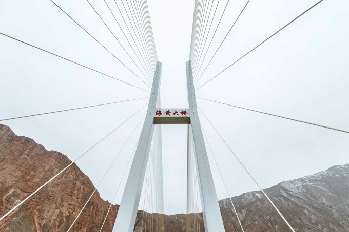 “海黄大桥不仅是青海省首座大跨径斜拉桥和高速公路景观大桥,也是目前西北地区跨径最大的双塔双索面钢混叠合梁斜拉桥。全长1743.5米,主跨560米,主塔设计为“H”形,南塔高193.6米、北塔高186.2米,全桥共88对176根斜拉索,建设规模和施工技术堪称“西北之最。”
