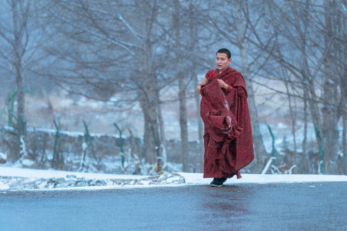 ▼调整好状态,继续前行,一个僧人赤裸着臂膀给我深刻印象,防弹武僧的形象在我脑海中一闪而过,只不过他是防寒武僧,要知道现在室外可是零下10度。我很想去请教一下:“这麒麟臂是如何炼成的?”我才下车短短10分钟,手和脸就变得乌红僵硬。