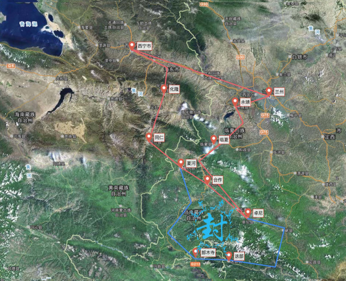 下图就是红色连线就是本次自驾路线,蓝色连线本来在规划之中,这样可以不走回头路,美特斯邦威(暴露年龄了)。不幸中了大雪封印术,警察叔叔告诉我:“前面封山了,你要不等两天,要不就去合作。”警民合作一家亲,我听了警察叔叔的话,乖乖合作到了合作。
