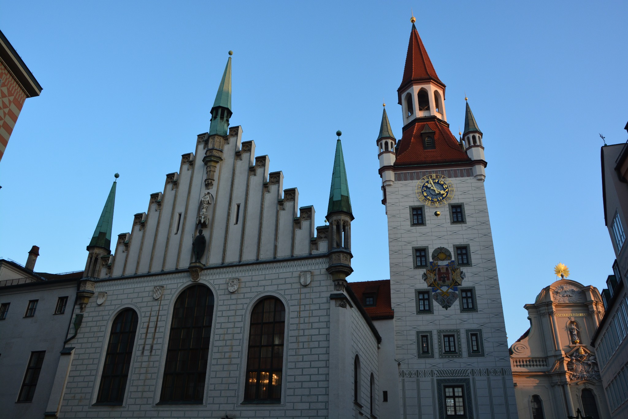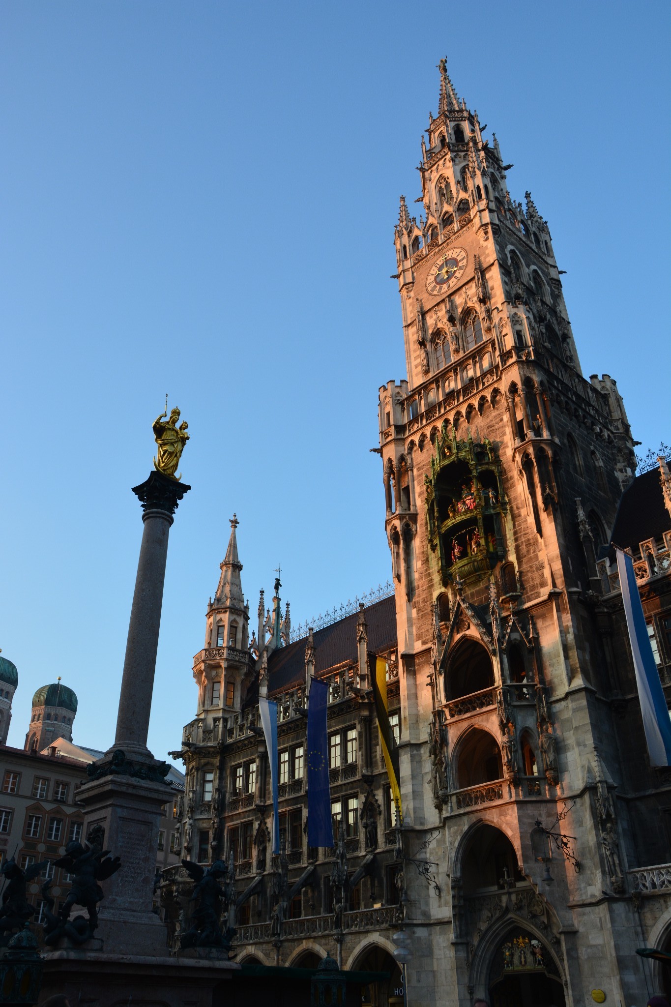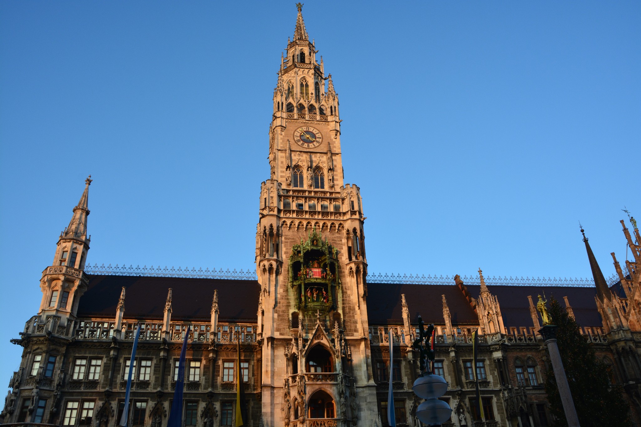 慕尼黑的新市政厅是一座巨大的哥特式建筑,正面的壁龛里装饰着众多巴伐利亚国王、圣人以及传说里的英雄的雕像,富丽堂皇,美轮美奂,旁边的老市政厅与之比起来,就显得小巧又精致,就像小白甜遇上了高大壕。新市政厅始建于1867年,历时近40年,直至1904年才完工,与圣母大教堂并列为慕尼黑城区的制高点。