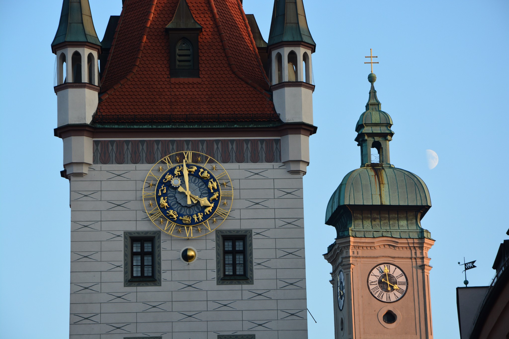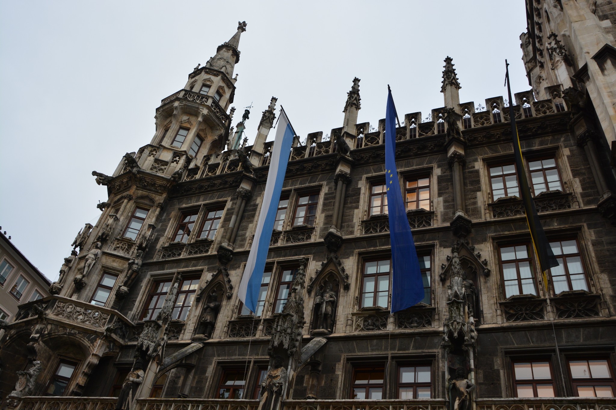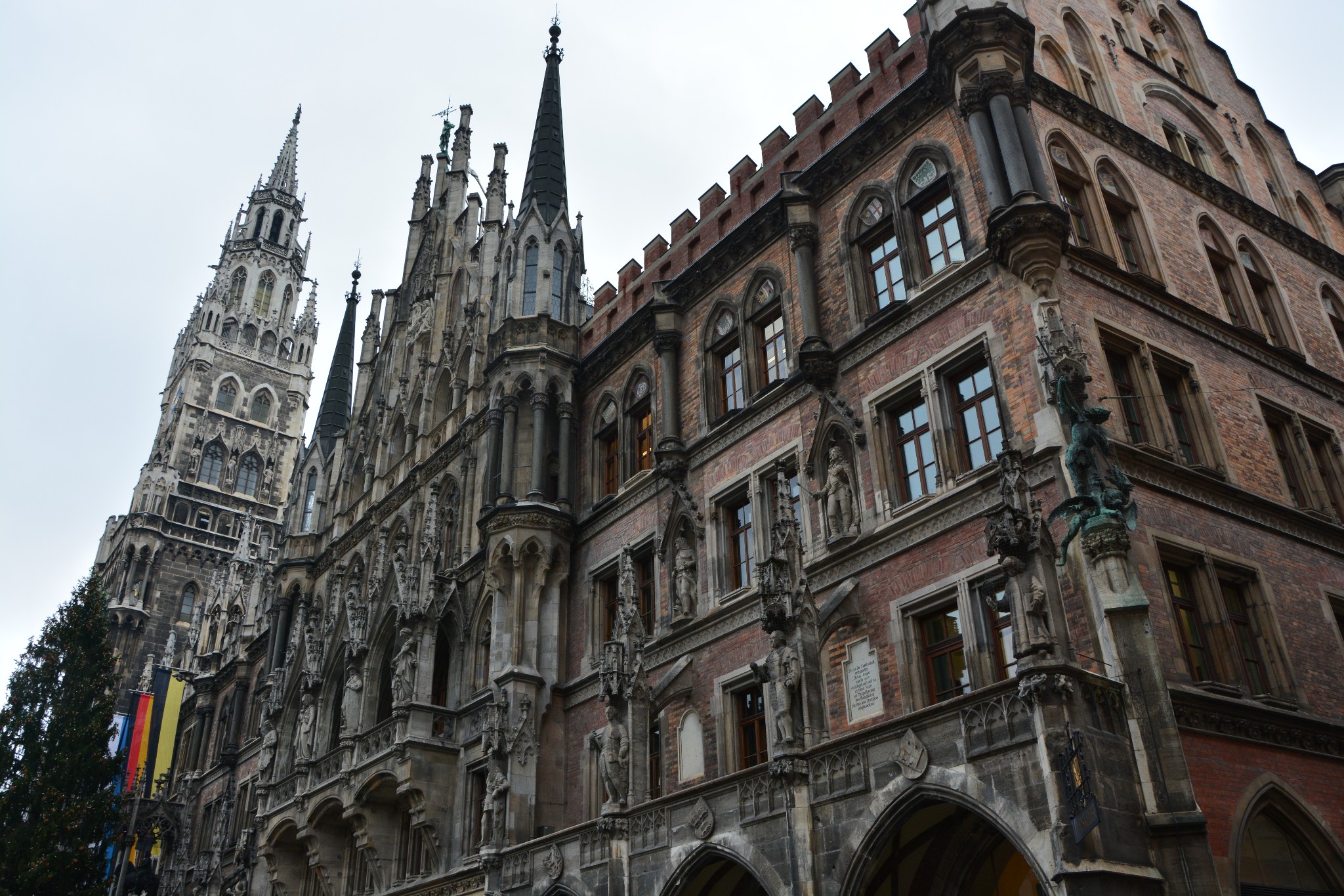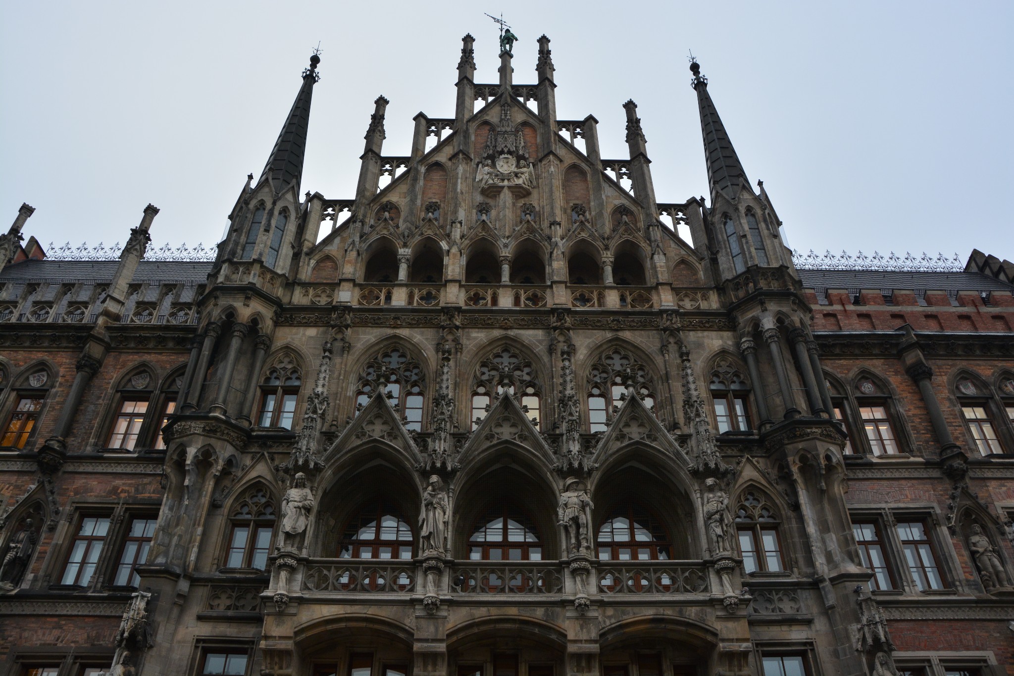 慕尼黑的新市政厅是一座巨大的哥特式建筑,正面的壁龛里装饰着众多巴伐利亚国王、圣人以及传说里的英雄的雕像,富丽堂皇,美轮美奂,旁边的老市政厅与之比起来,就显得小巧又精致,就像小白甜遇上了高大壕。新市政厅始建于1867年,历时近40年,直至1904年才完工,与圣母大教堂并列为慕尼黑城区的制高点。