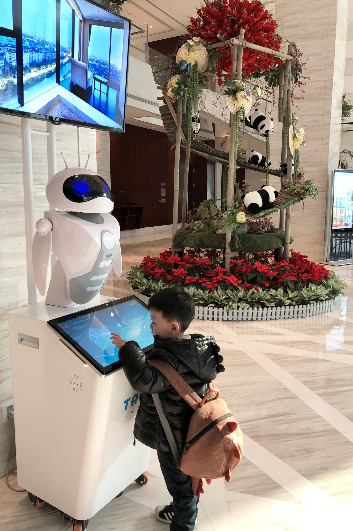 酒店大堂有一个智能机器人,儿子特别喜欢。登记入住的时候,儿子一直围着智能机器人问东问西的,很有趣。