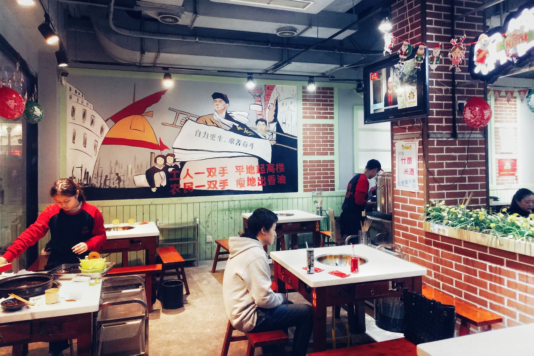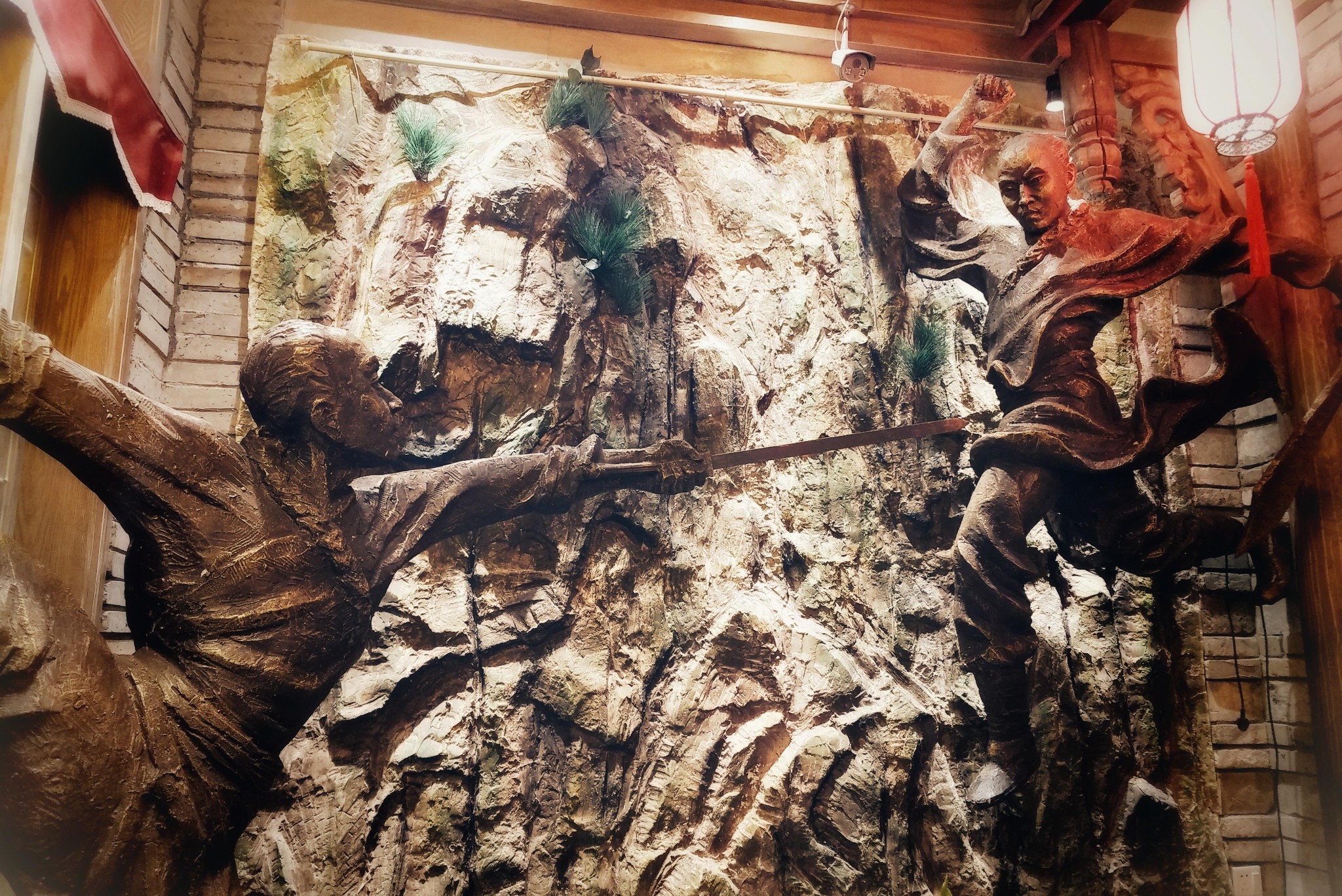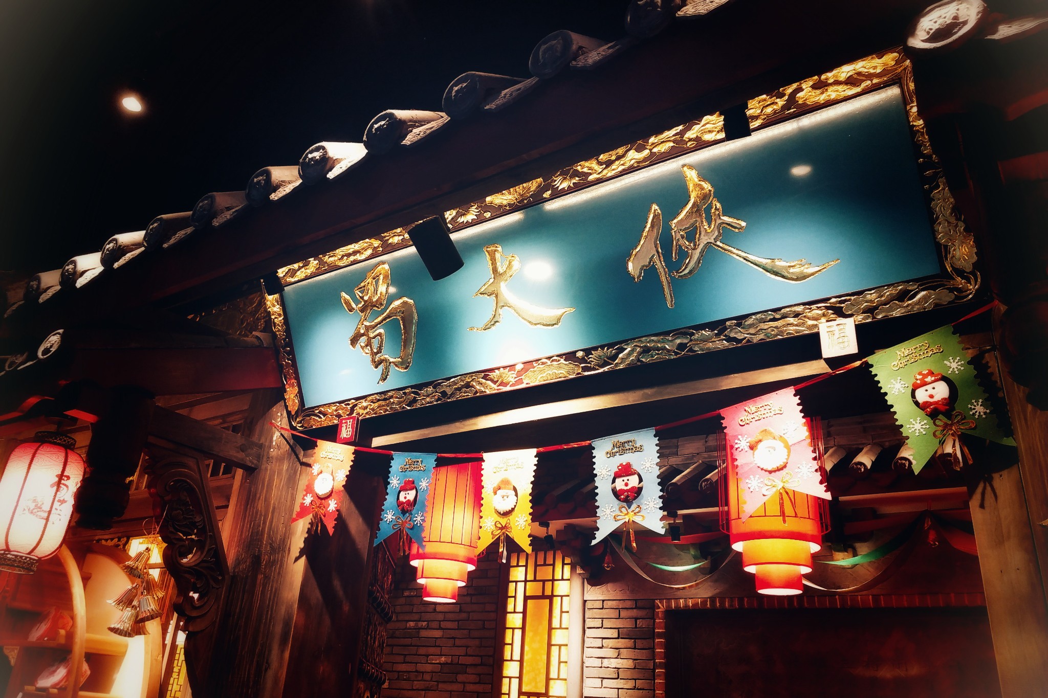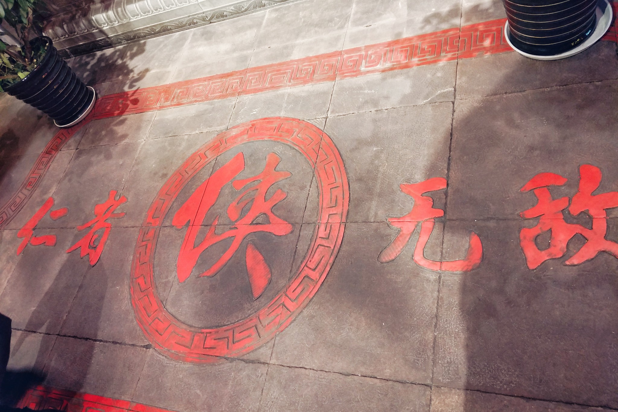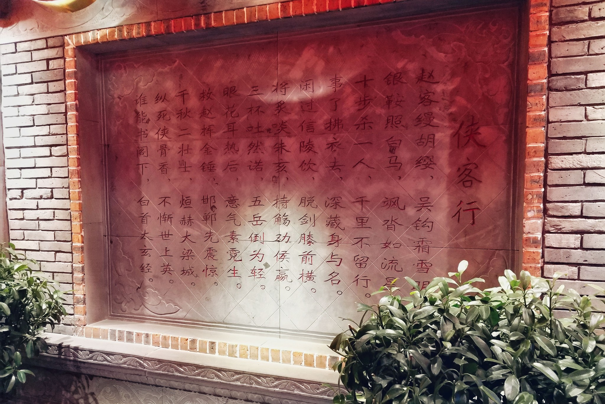 蜀大侠门店的装修非常古风,从装潢布置到菜名,甚至菜品的摆盘都尽显古风侠客情怀,很有大侠范儿。进门便是一首“侠客行”提于墙上,脚下有字“仁者无敌”,当真是了不得。