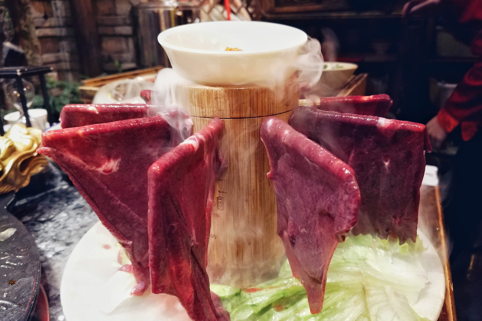 锅底必须牛油红锅,有道是“红锅配龙头,要啥啥就有”...好吧,这句是我信口胡编的,哇哈哈哈。其实,我是觉得牛油红锅是吃四川火锅的硬道理,没得商量。我们点了:大刀肝片 , 太极双滑 , 冰川鹅肠 , 碗碗鲜鸭血 , 大侠水牛毛肚 , 红糖糍粑...一大堆,总的来说味道都很好。这里点名表扬大刀肝片,那个香...那口感和味道,真的是太好吃了,现在回想都会口水一地。