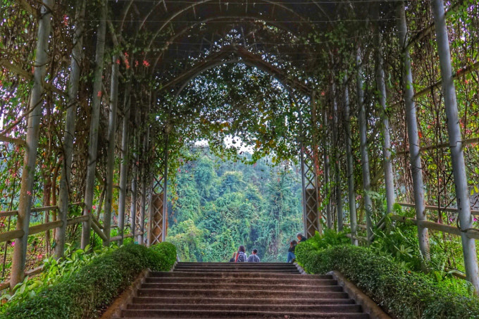 藤条型的植物爬满铁柱,远处丛山峻岭,仿佛坠入爱丽丝的梦境。