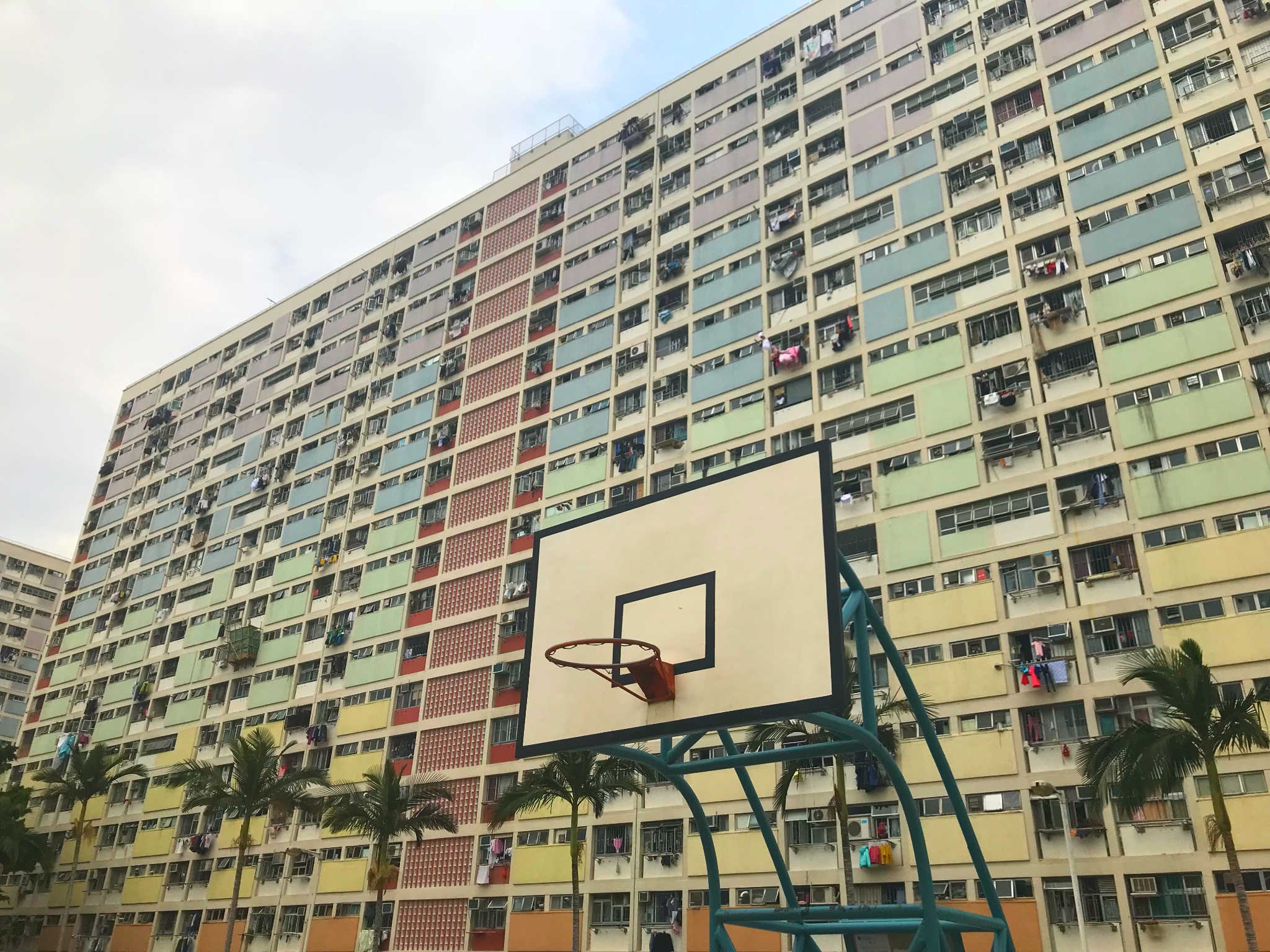 彩虹邨在彩虹地铁站C4出口,顺着指示牌走出站,位于楼宇中间的2层停车场的一个篮球场,是拍摄彩虹屯的最佳位子。