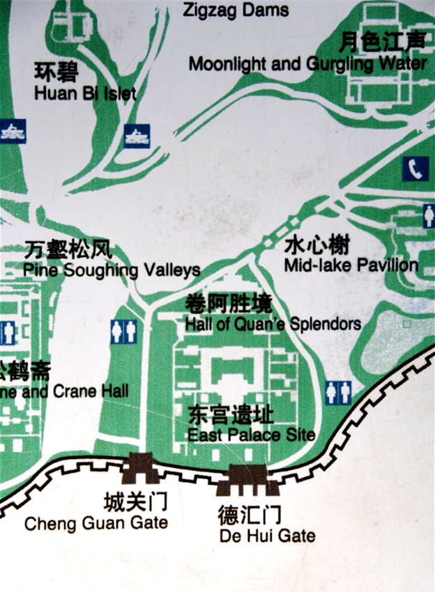 东线:进德汇门,过东宫,以卷阿胜境为起始点。沿东线游览可参观到的景点:水心榭、文园、清舒山馆、月色江声、戒得堂、花神庙、新所、金山、香远益清、热河泉。