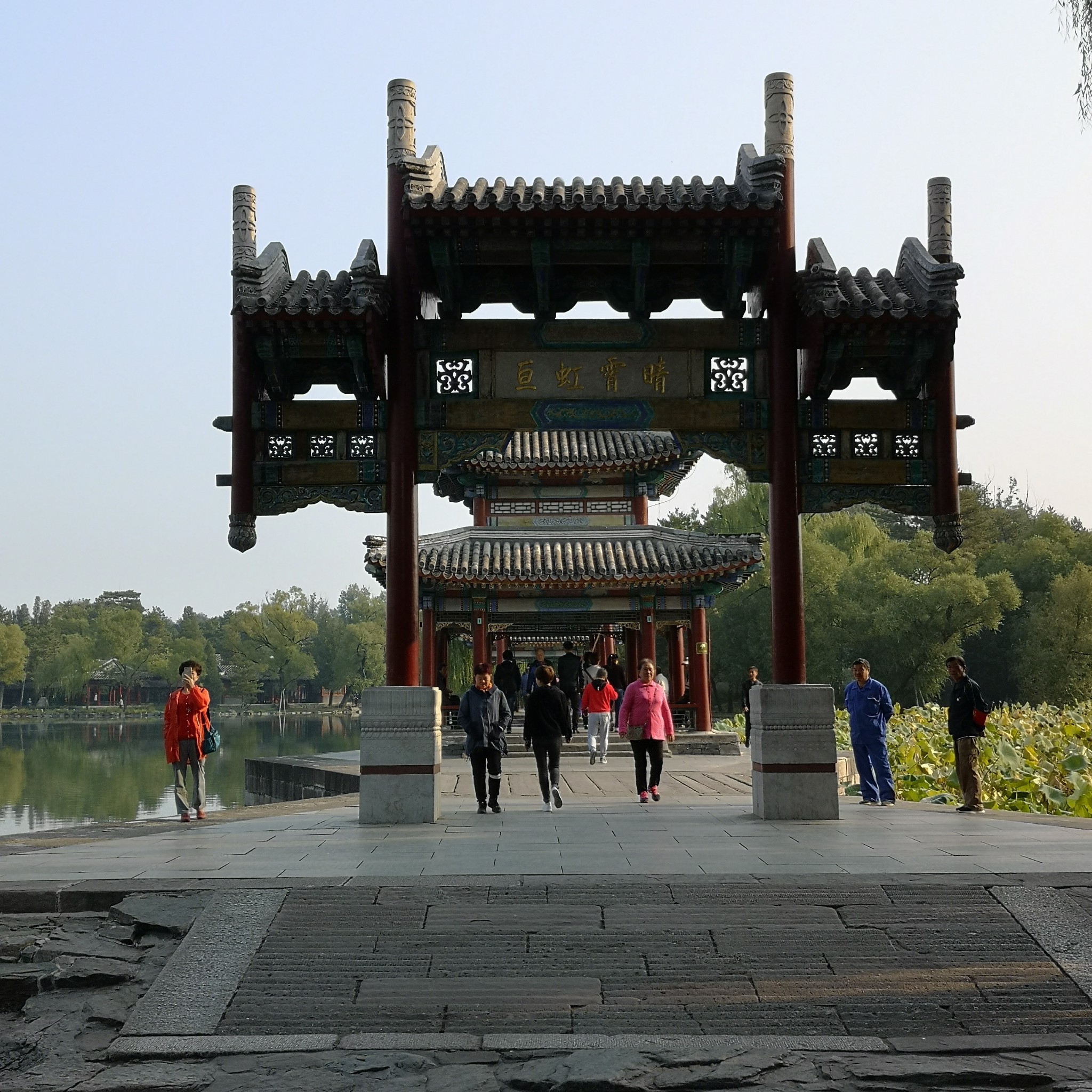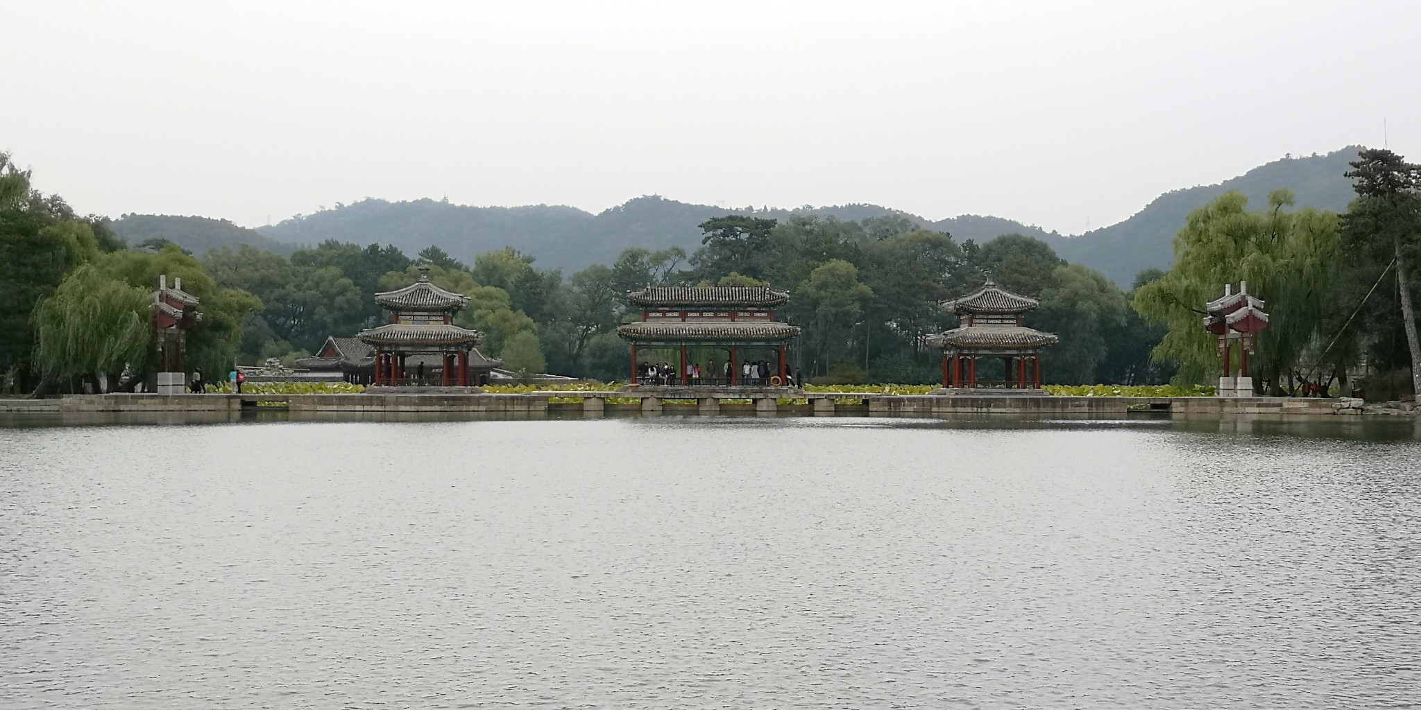 水心榭中间为长方形重檐歇山卷棚顶建筑,南北为重檐攒尖顶亭子,其两端为四柱牌楼。这是隔下湖远眺水心榭。